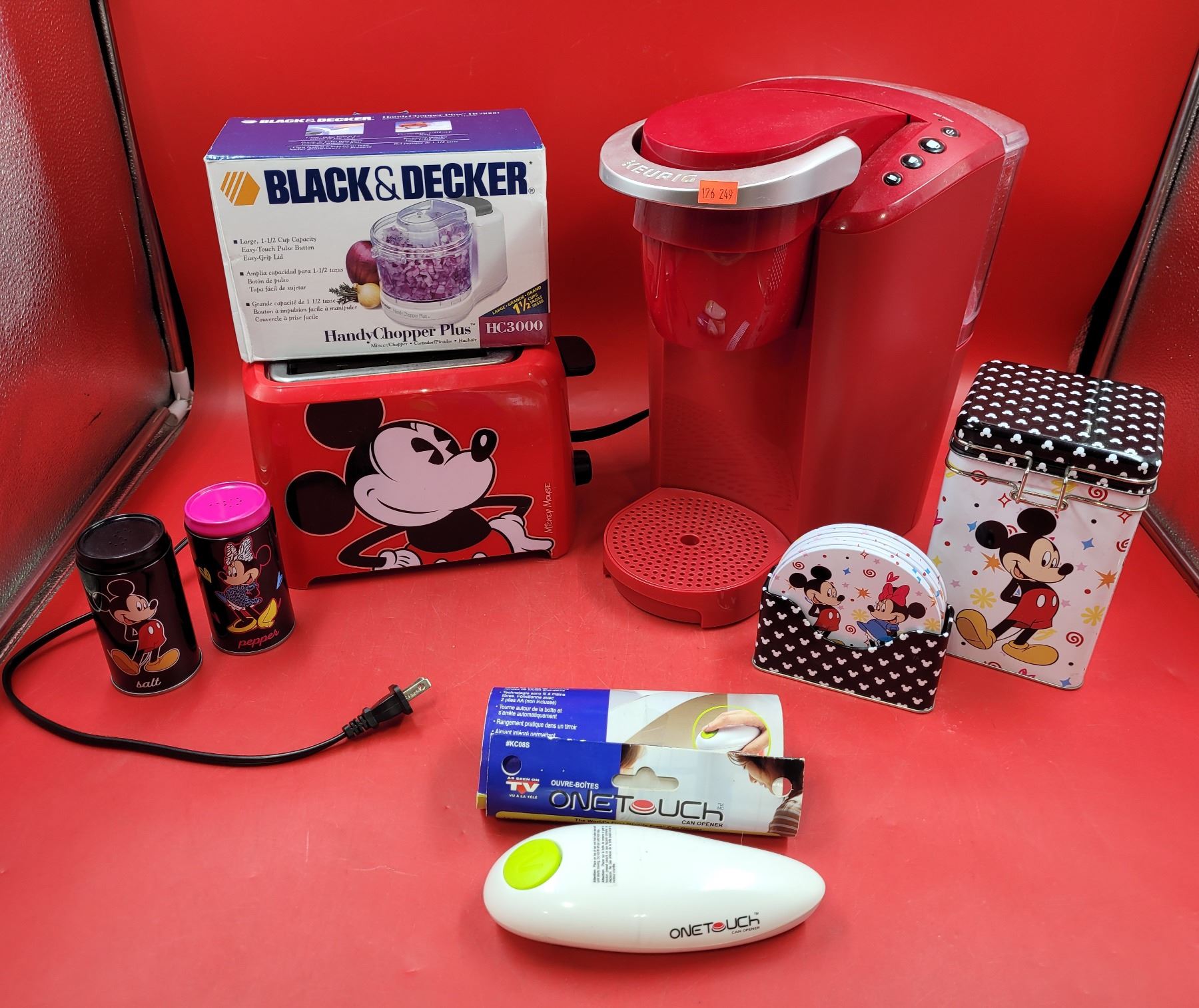 Kitchen & Home Lot w/ Red Keurig, Chopper, Mickey Mouse Toaster, One Touch Can Opener, & More