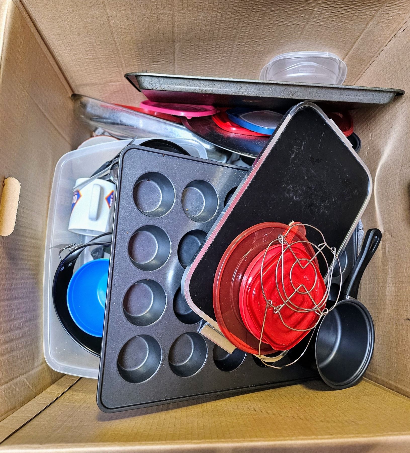 Large box of assorted kitchen items. Plates, cutlery, baking sheets, muffn tins etc etc