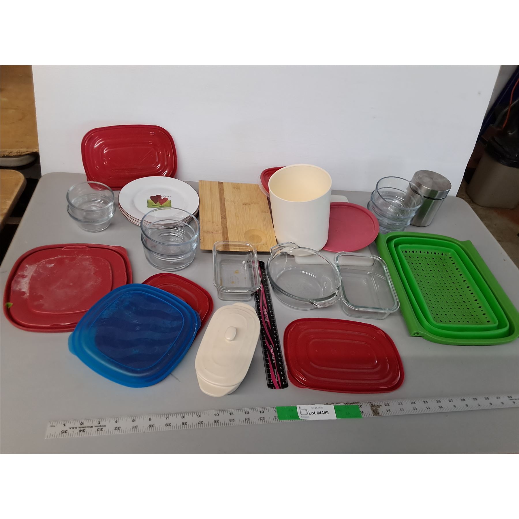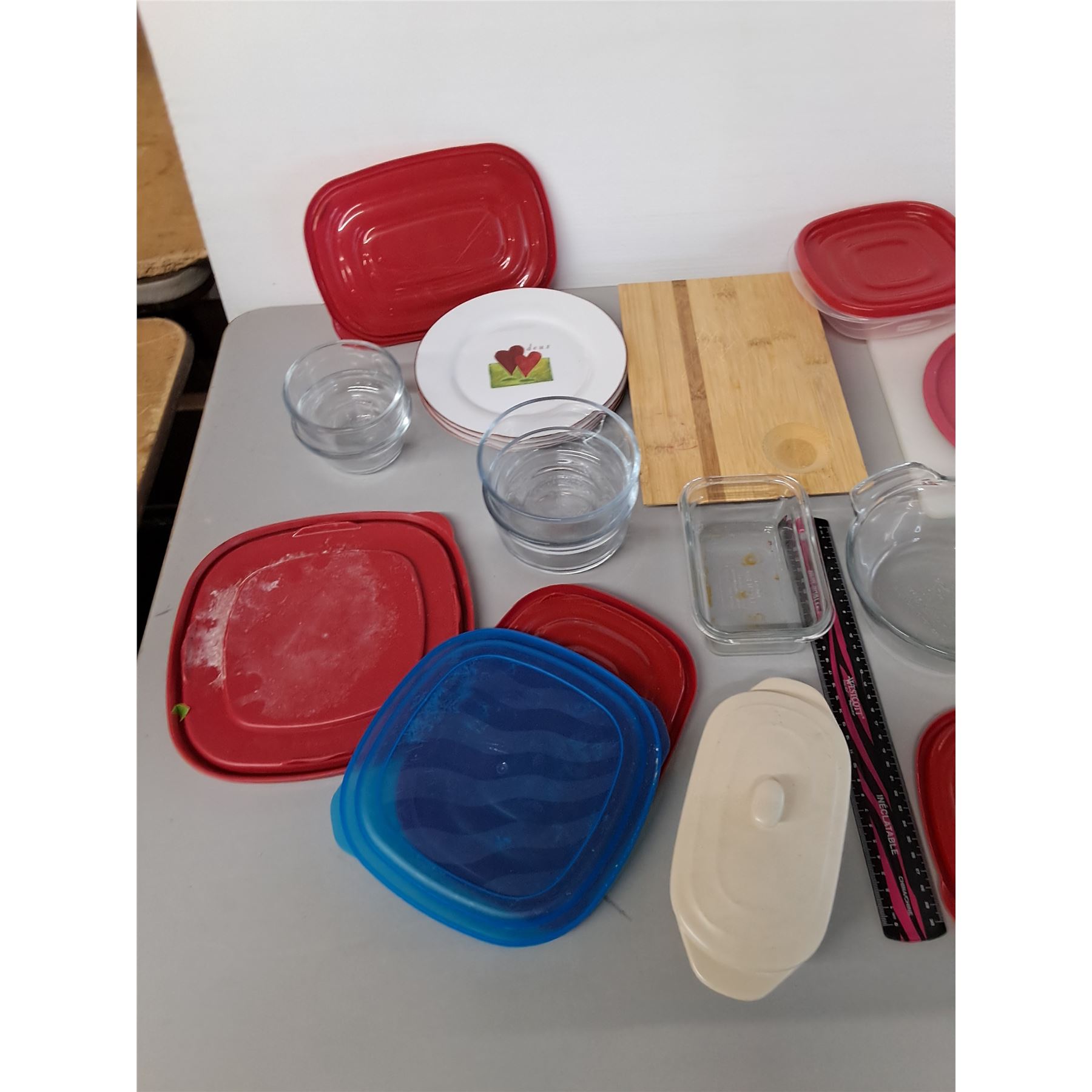 Kitchen Lot- Glass Containers- No Lids, Cutting Board, Plates, Misc.