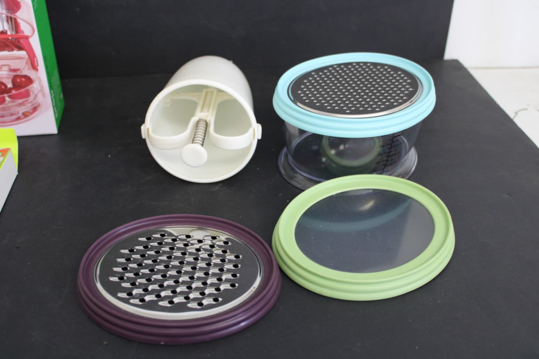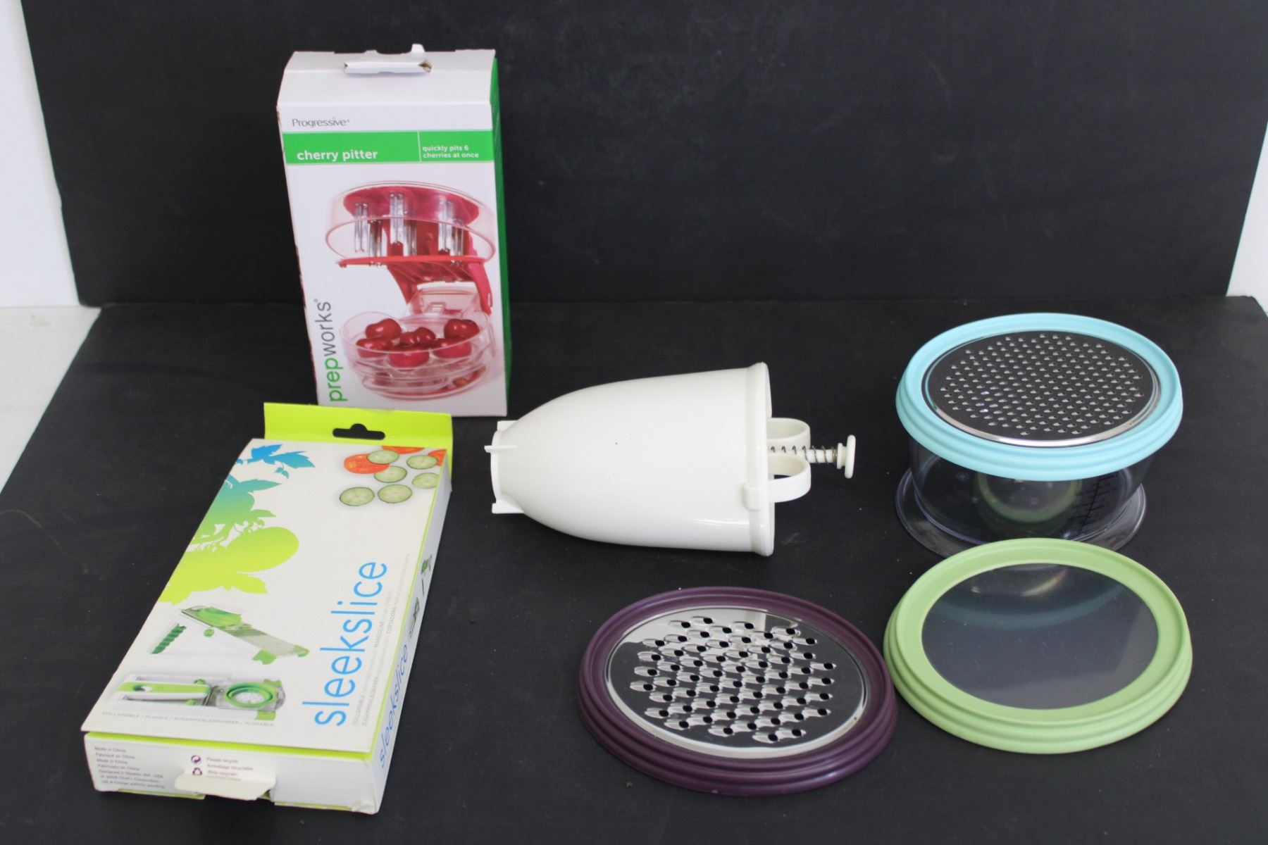Kitchen Lot: Slicer/Mandolin, Grater, Cherry Pitter, Misc.