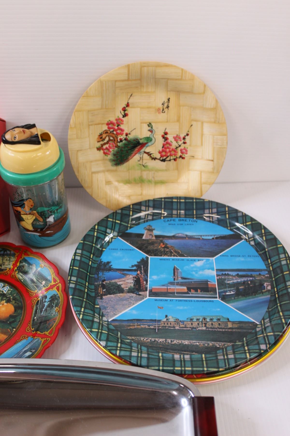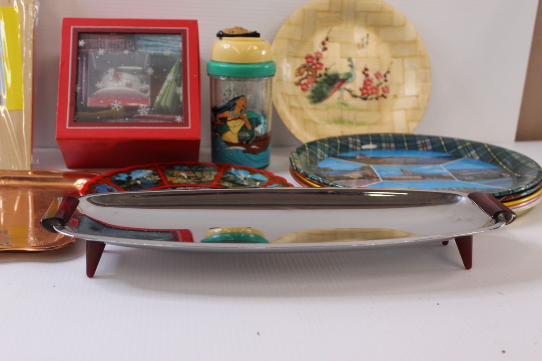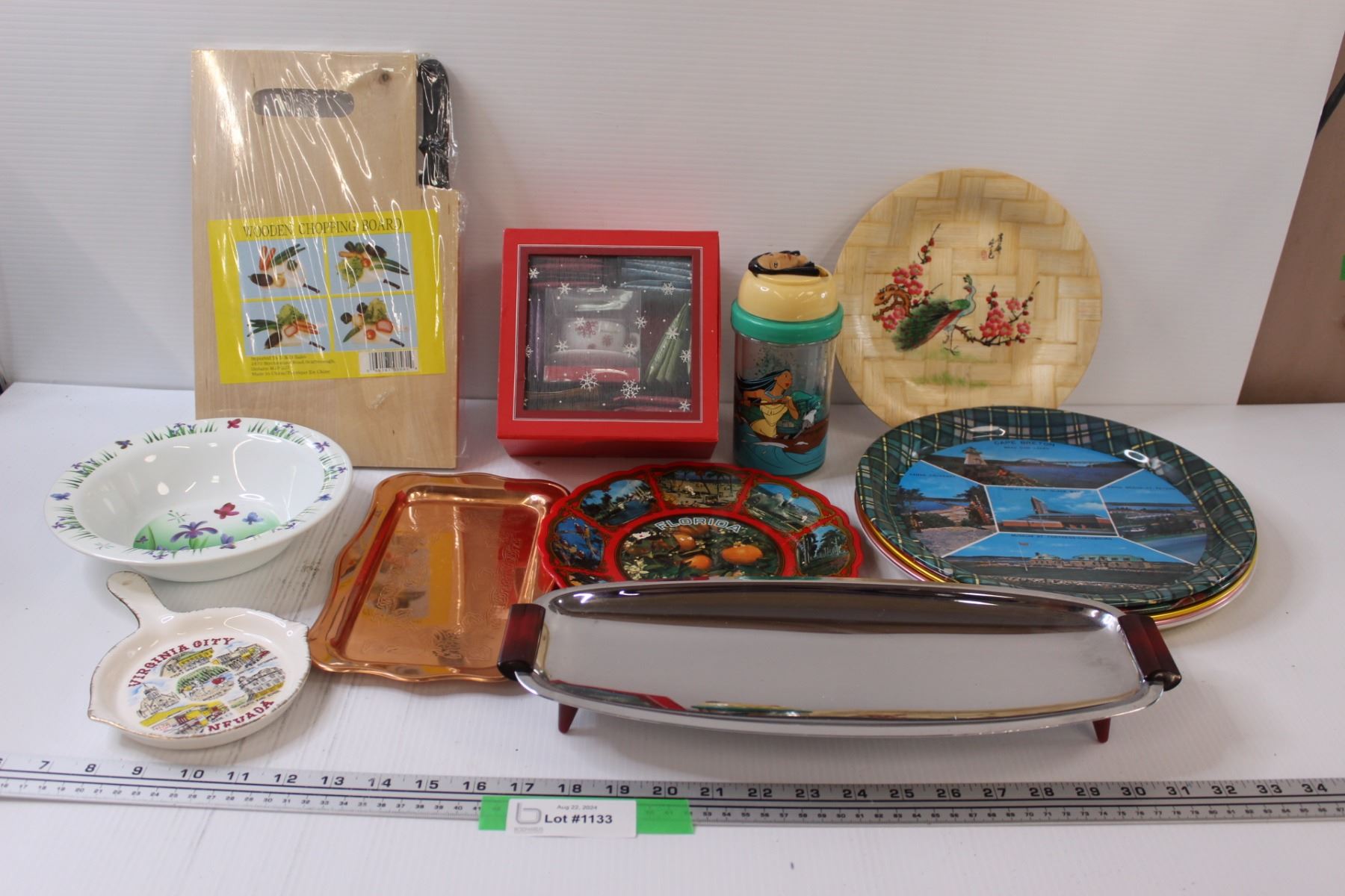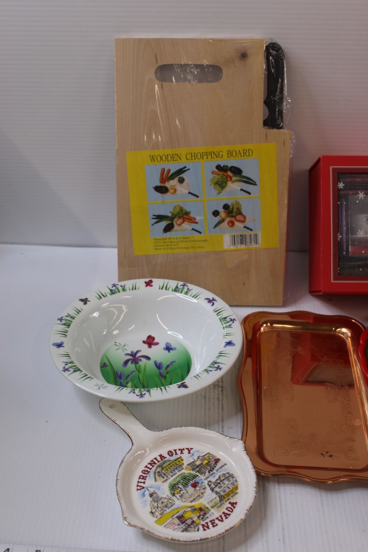 Kitchen Lot: Wooden Chopping Board, Serving Trays, Tea Set, Vintage Metal Serving Tray, Misc.