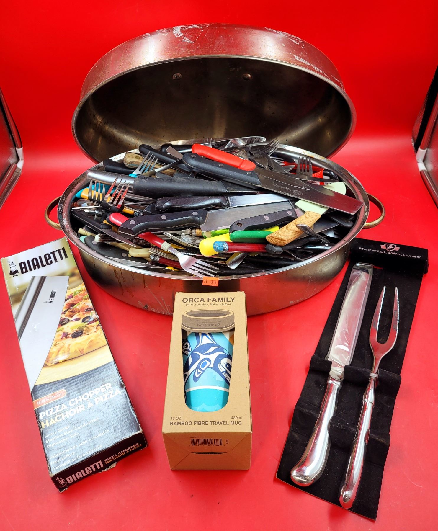 Kitchen Lot w/ Assorted Utensils, Bamboo Orca Family Mug, & Pizza Chopper