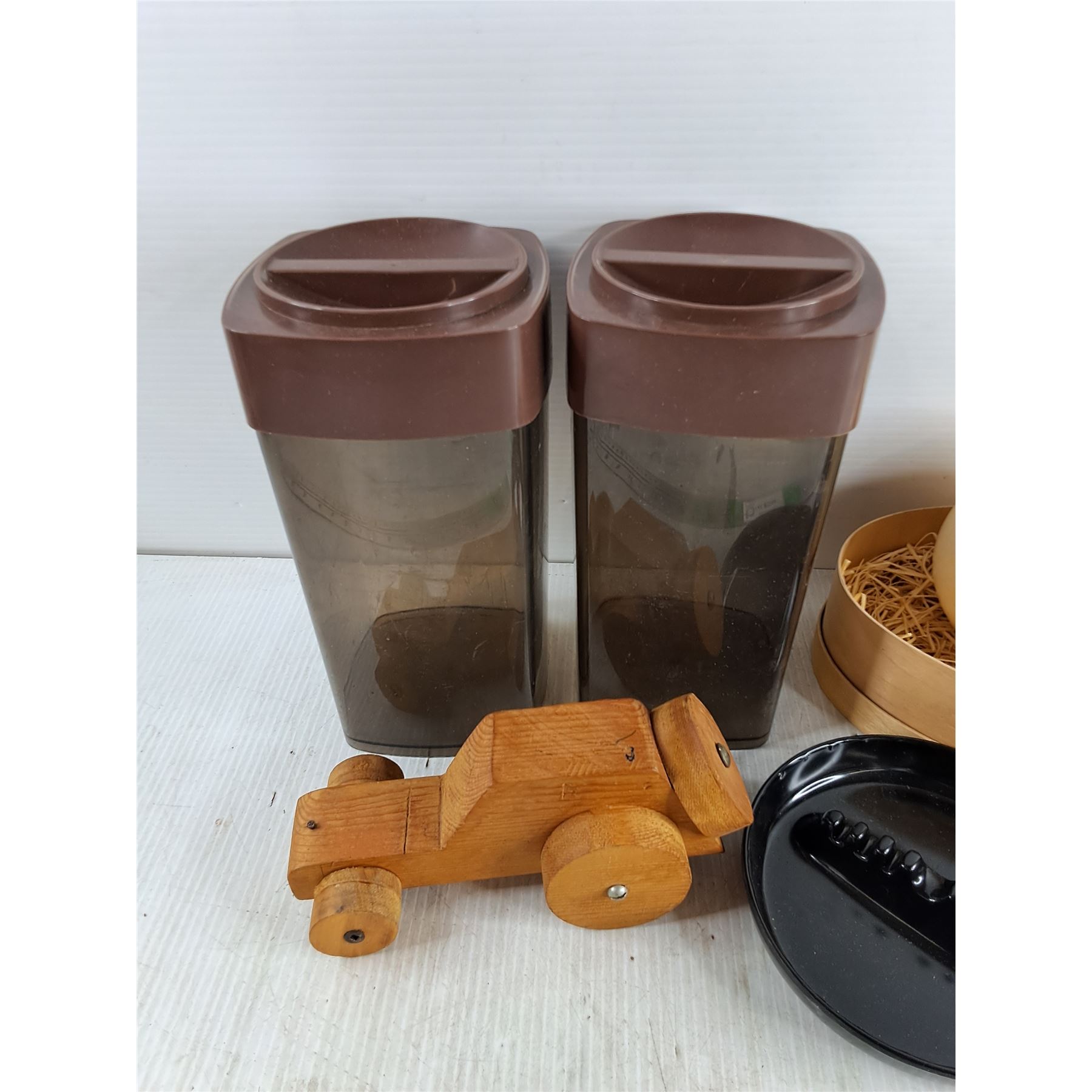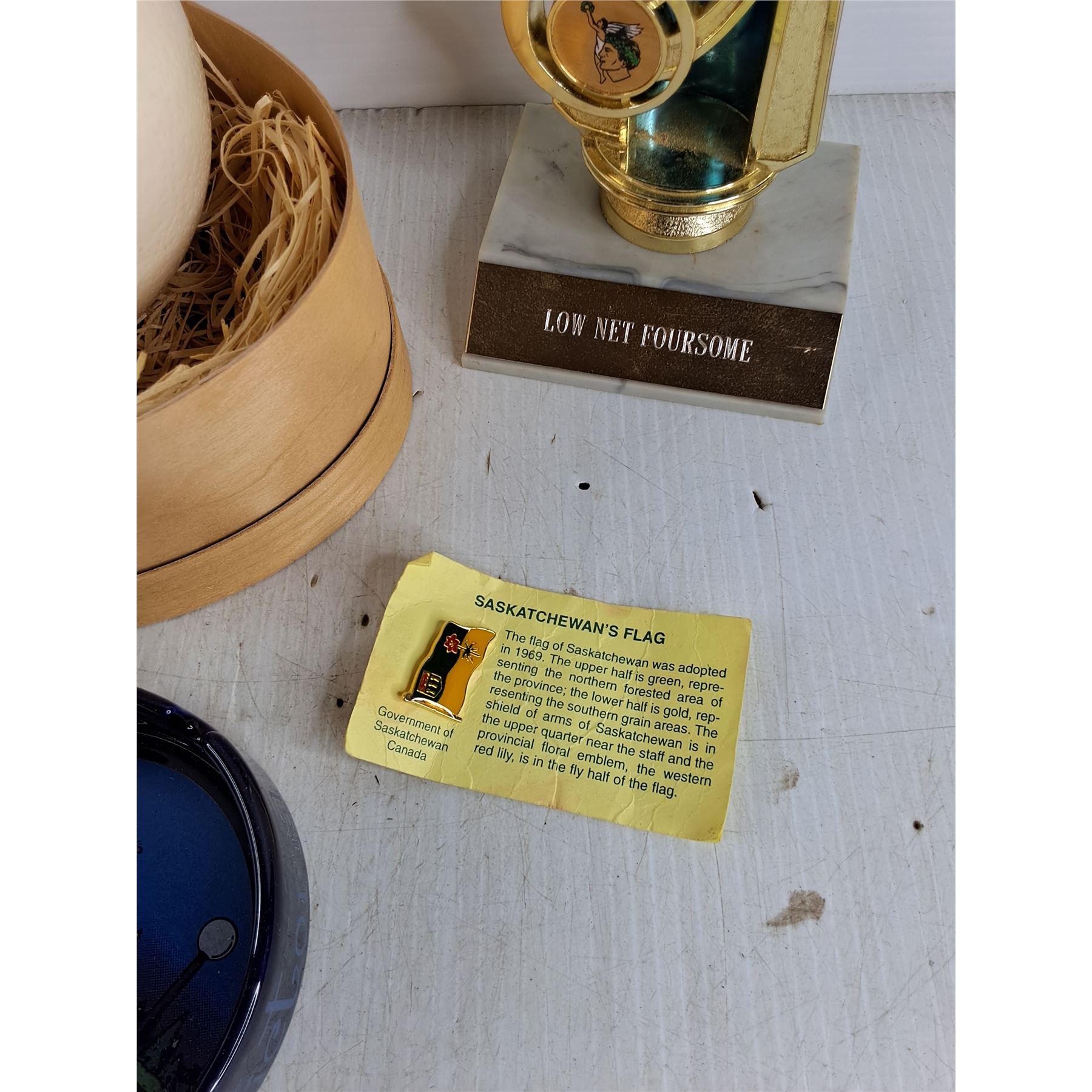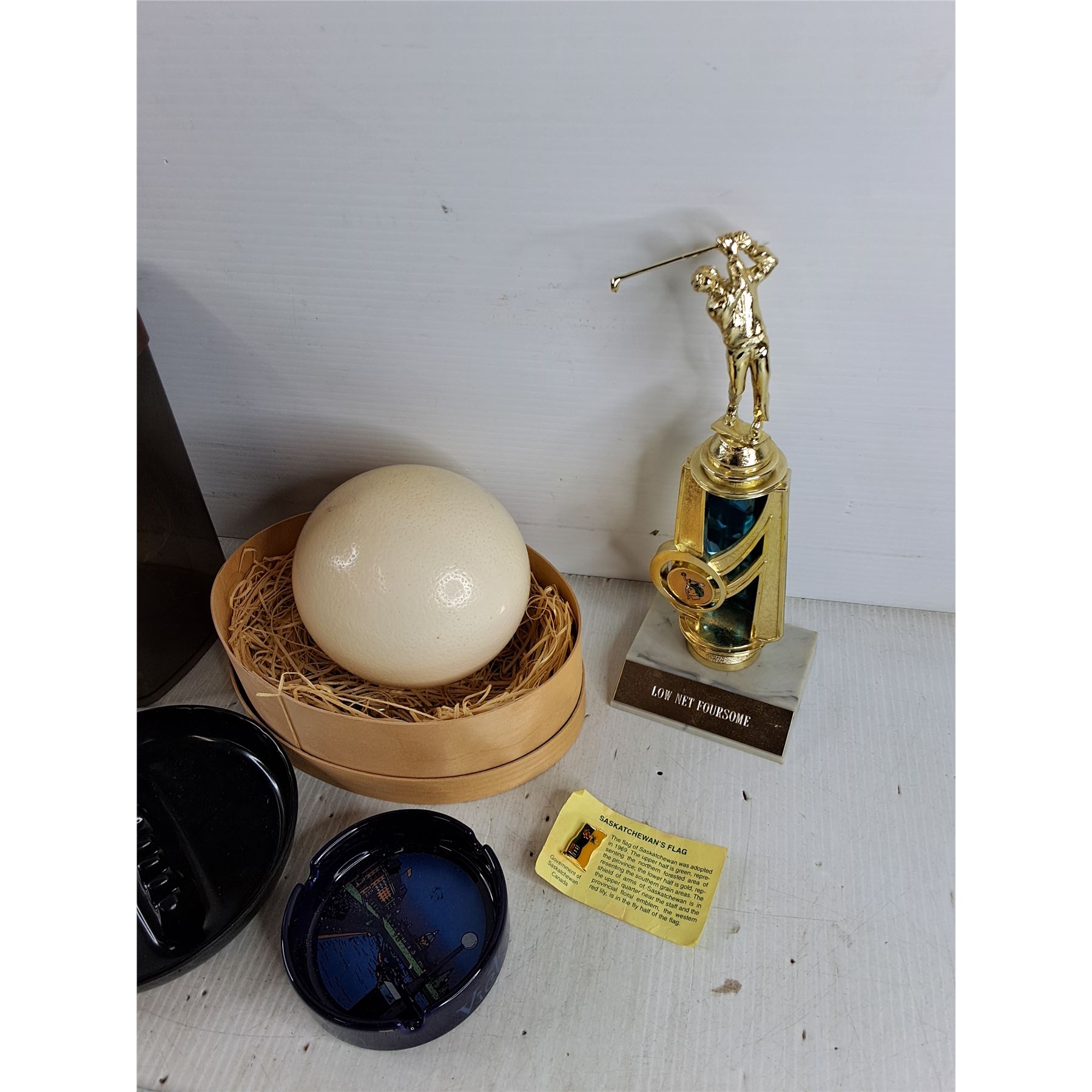 Kitchen Storage Canisters, Ash Trays, Ostrich Egg Shells, SK Flag Lapel Pin, Misc