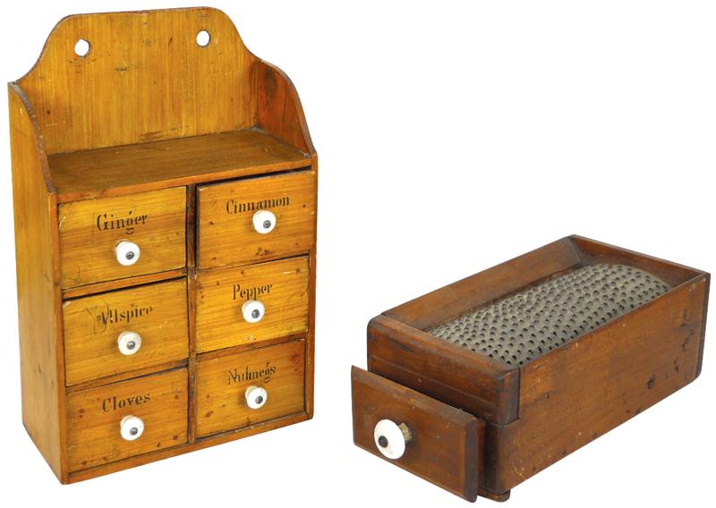 Kitchen primitives (2), grain-painted 6-drwr spice cabinet w/porcelain knobs, c.1890's, Exc cond, 13"H x 8.25"W & box grater w/drwr, walnut & pierced tin, Exc cond, 4"H x 5"W x 11.5"L.