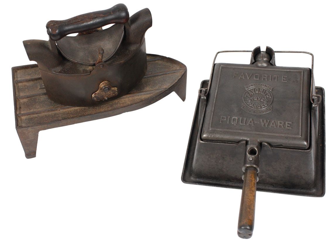 Kitchenware (3), cast iron Favorite Stoves & Ranges Piqua-Ware waffle iron, Beach Russ Co.-Chicago 3-footed trivet & Neplus Ultra iron, patd 1902, all Exc cond.