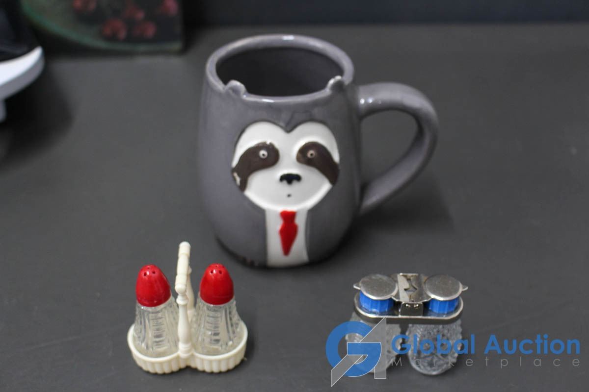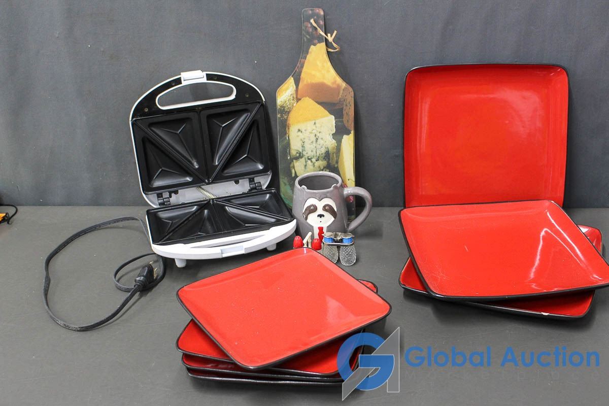 Kitchenware: Sandwich Grill, Plates, Cup, Salt/Pepper Shakers, & Cutting Board