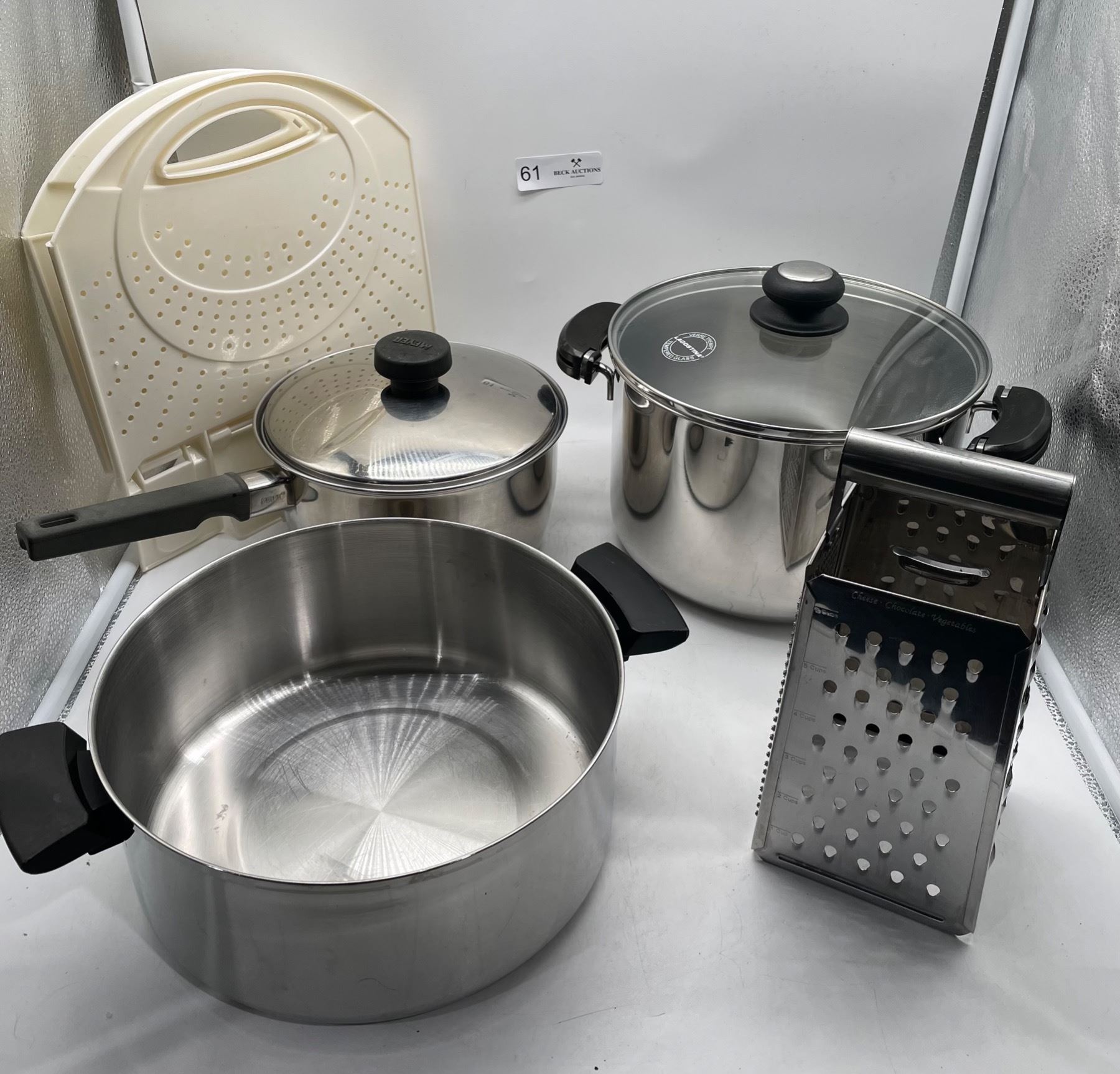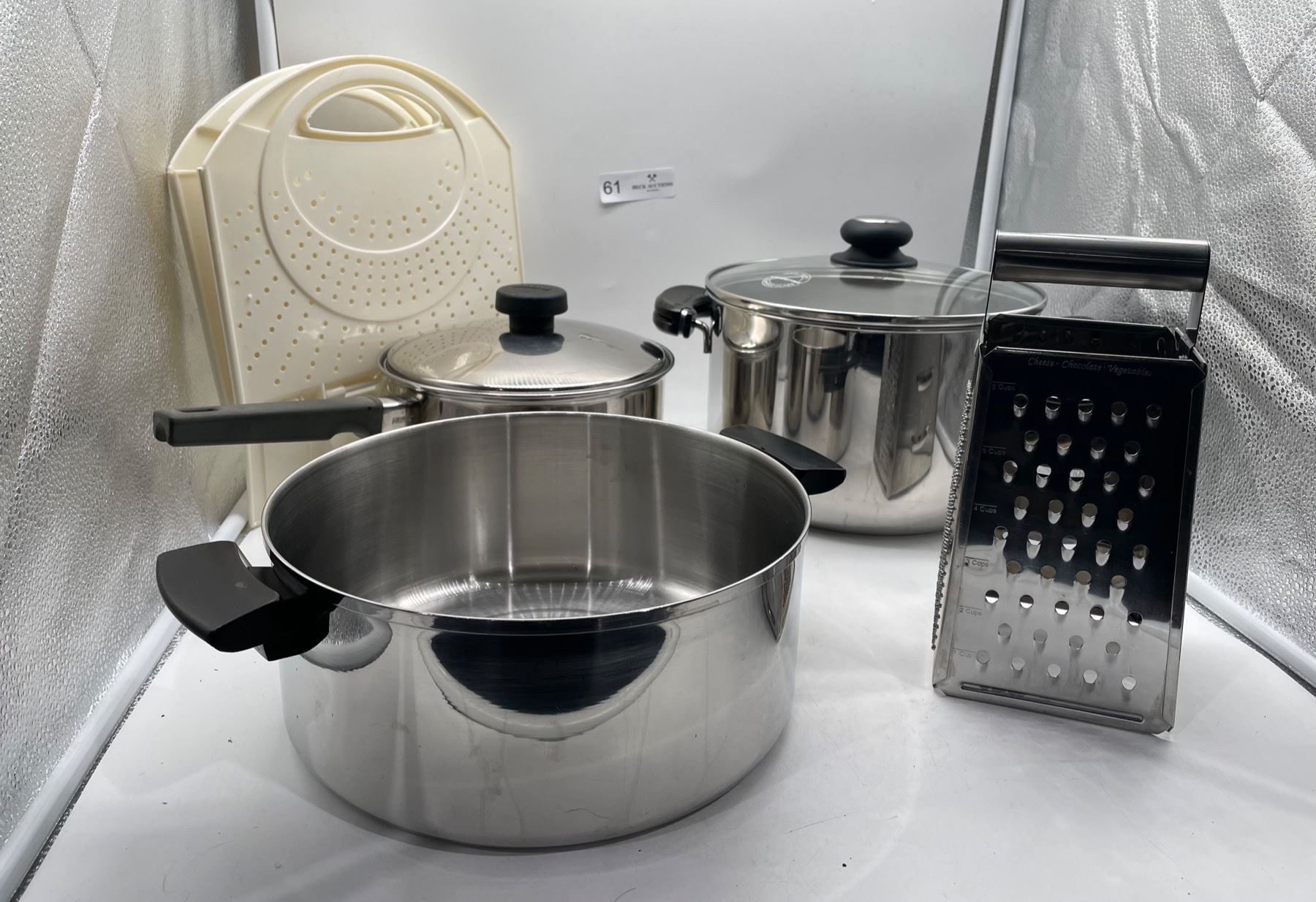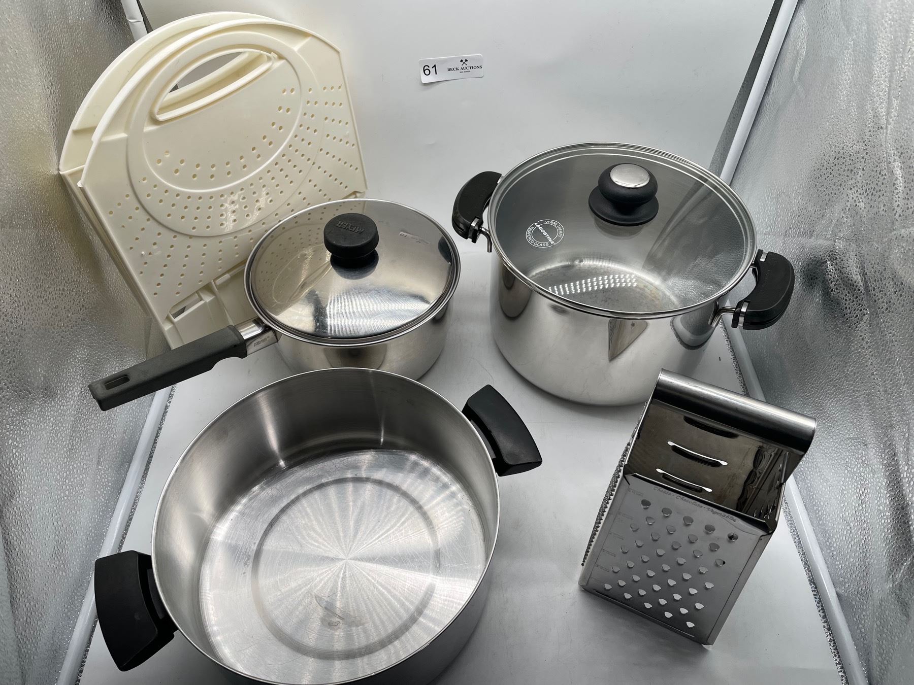 Kitchen pots (Lagonstina, Coronet - missing lid, Meyer) a plastic compact strainer, a cheese grater in lightly used condition.