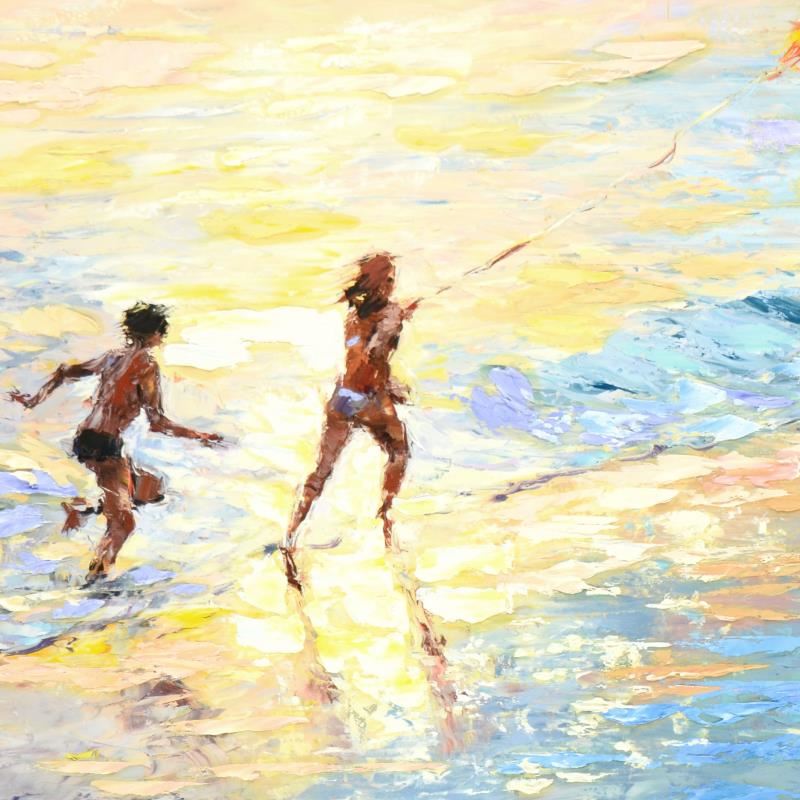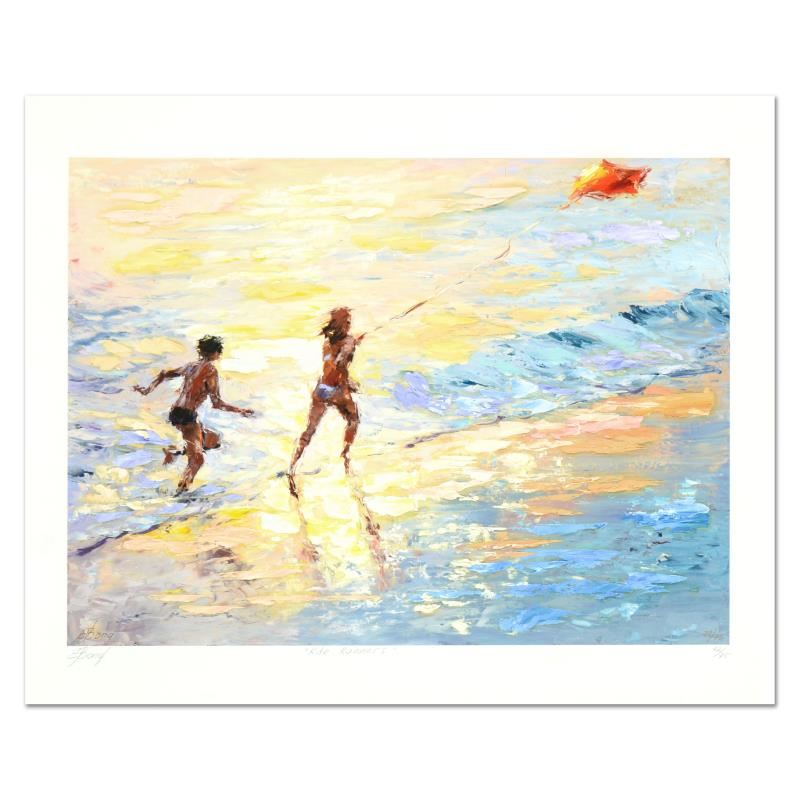 "Kite Runners" is a hand embellished limited edition mixed media on paper by Elena Bond, titled, numbered and hand signed by the artist. Includes Letter of Authenticity. Measures approx. 24" x 20" (border), 21" x 16" (image).