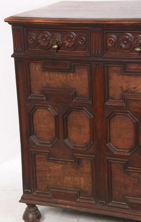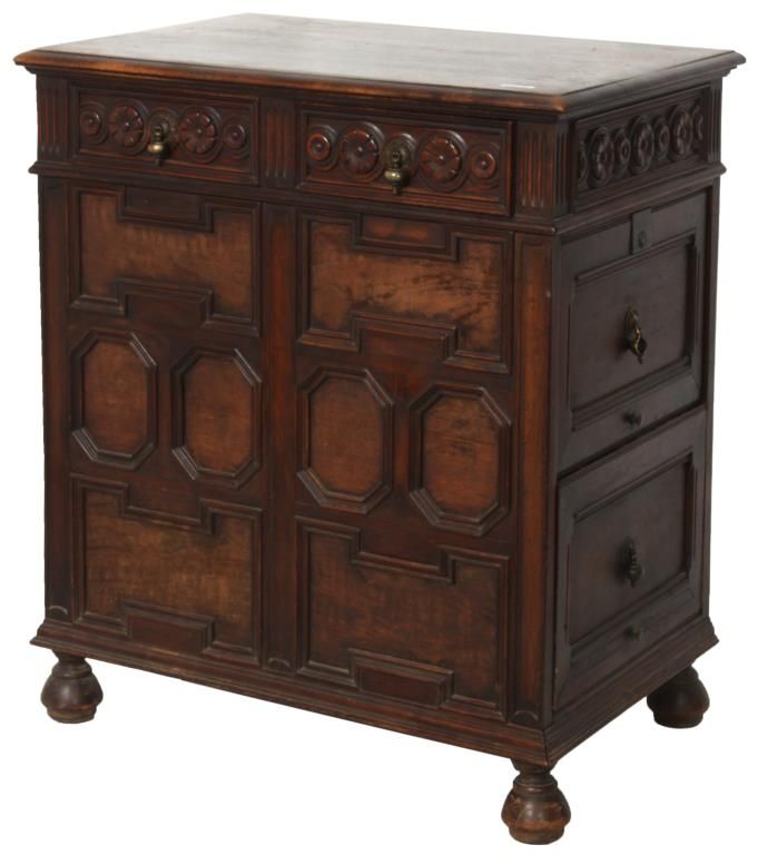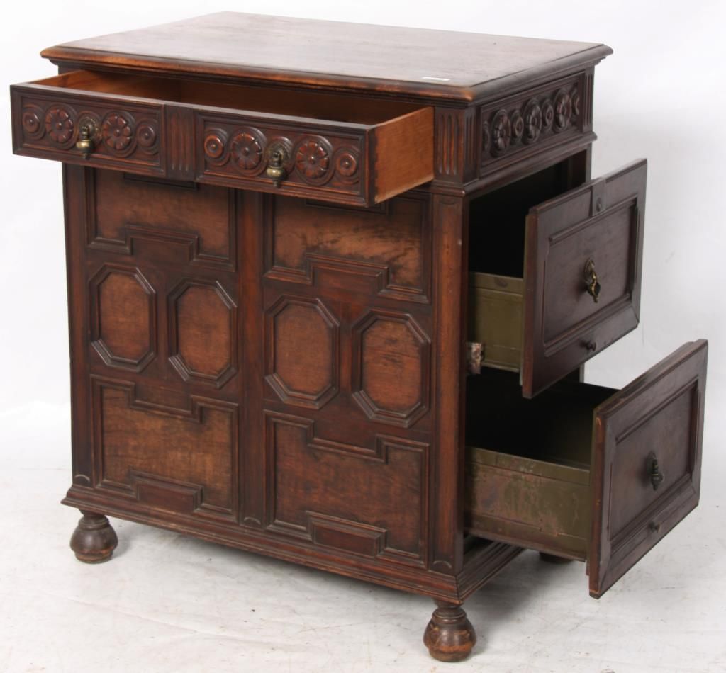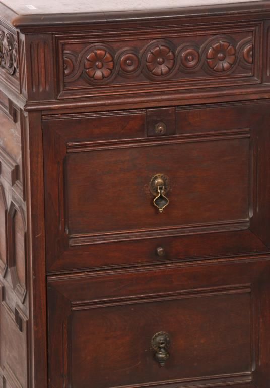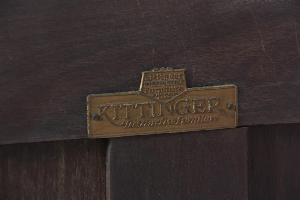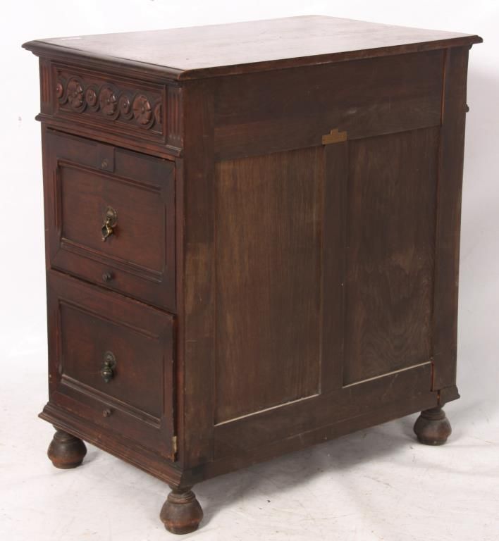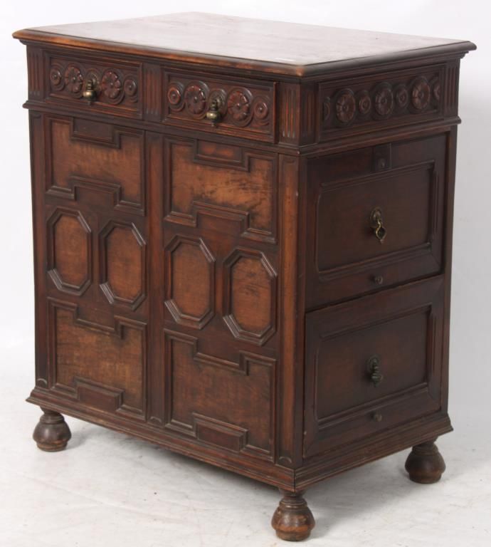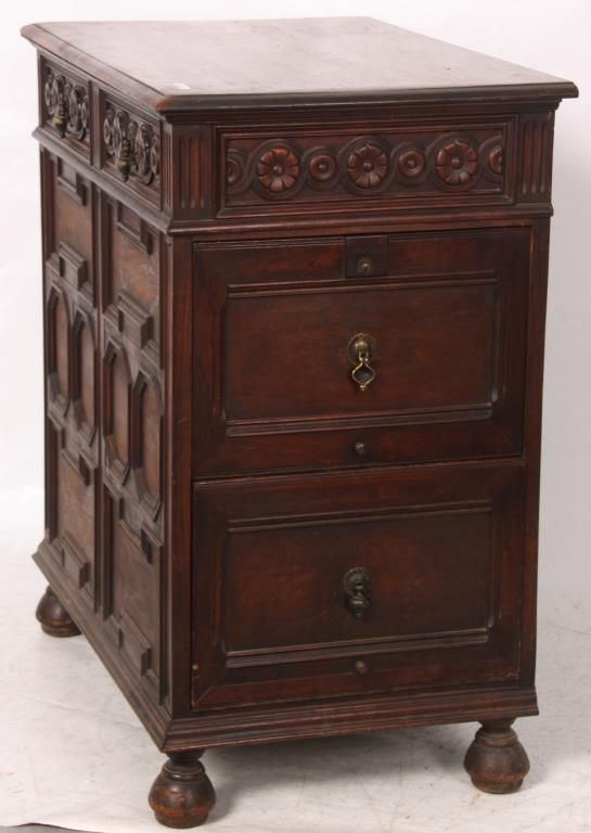 Kittinger Carved Oak File Cabinet. The front has a full length drawer in the top with 2 brass pendent teardrop pulls and carved front, nice molding and trim-work on the front and left side; the right side has 2 large file drawers with brass pendent teardrop pulls on inset panels and metal lined interiors. Signed on the back with a brass Kittinger tag and is in very good condition and original finish. 38 in. high x 33.25 in. wide x 22 in. deep.