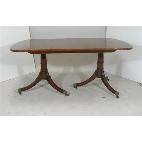 Kittinger Banquet Dining Table - Mahogany, Double Pedestal Style with reeded tripod bases, termination in brass cuffs and casters. Underside of table with metal "Kittinger" plaque and paper label "Gainsborough" (the design). Two additional leaves. Table surface is excellent, however table edge has several scrapes from normal use. Some leg joints repaired. Graceful addition to your dining room. Dimensions - 30"h x 66"l x 44"w, each leaf is 18"w.