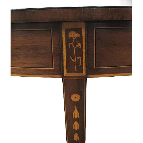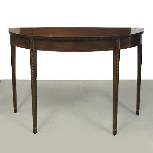 Kittinger demilune mahogany and inlaid table; line inlay on top and apron; four square tapered legs with line and bellflower inlay headed by cornflower inlay; inlaid cuffs at ankles; label and brand on bottom; mid 20th C.; 33 1/4" high x 50 1/2" across x 16" deep (no visible defects)