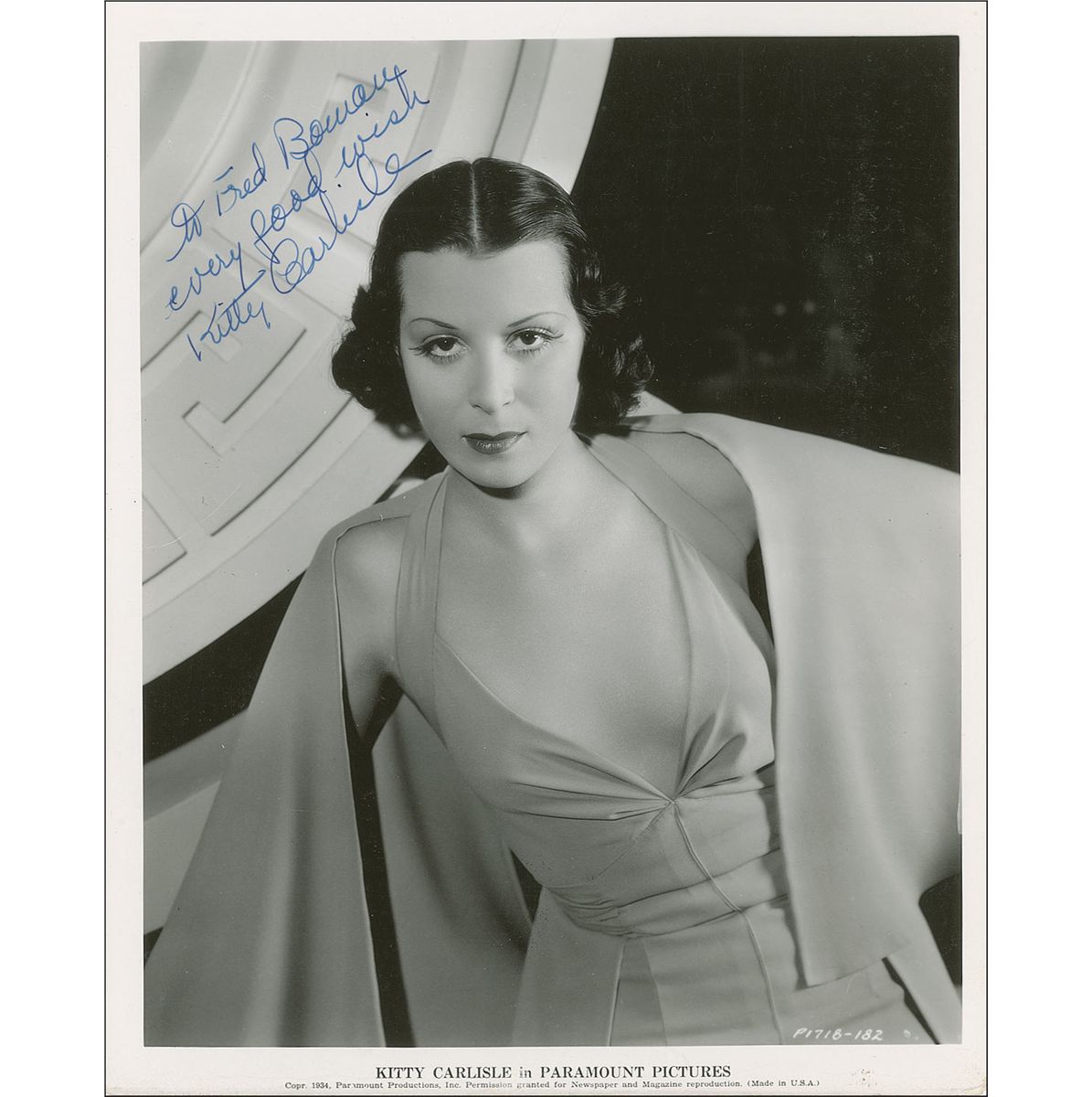 Alluring vintage double-weight glossy 8 x 10 Paramount Pictures promotional photo of Carlisle in a low-cut dress, signed and inscribed in fountain pen, “To Fred Bowau, every good wish, Kitty Carlisle.” In fine condition, with some light surface marks and impressions.