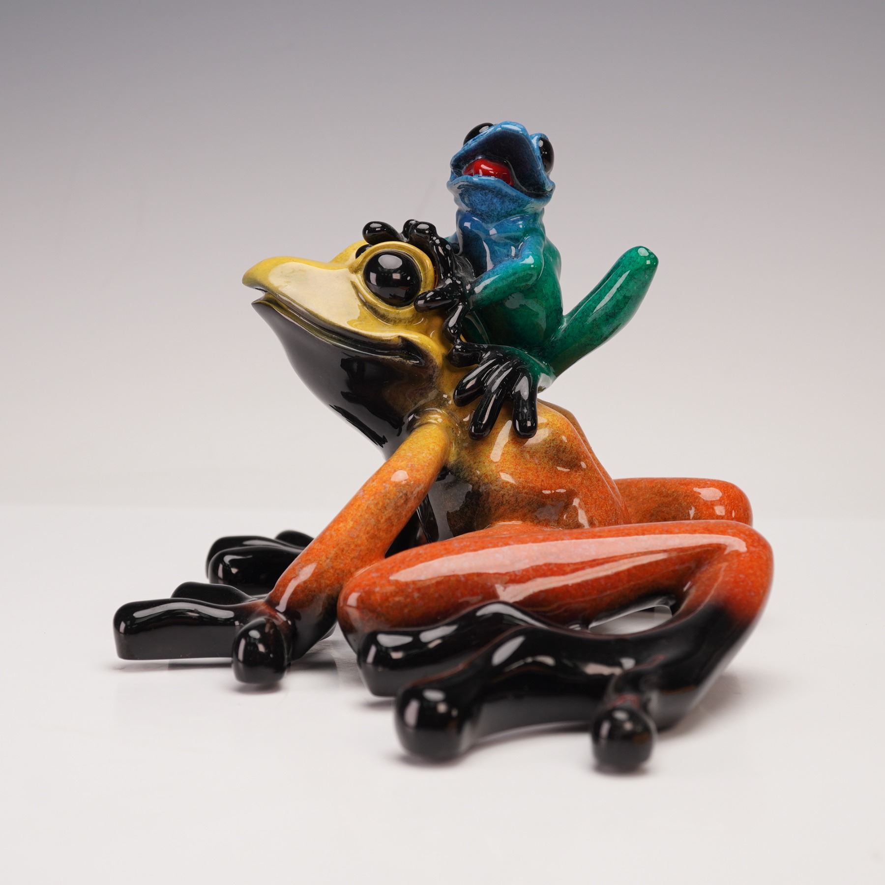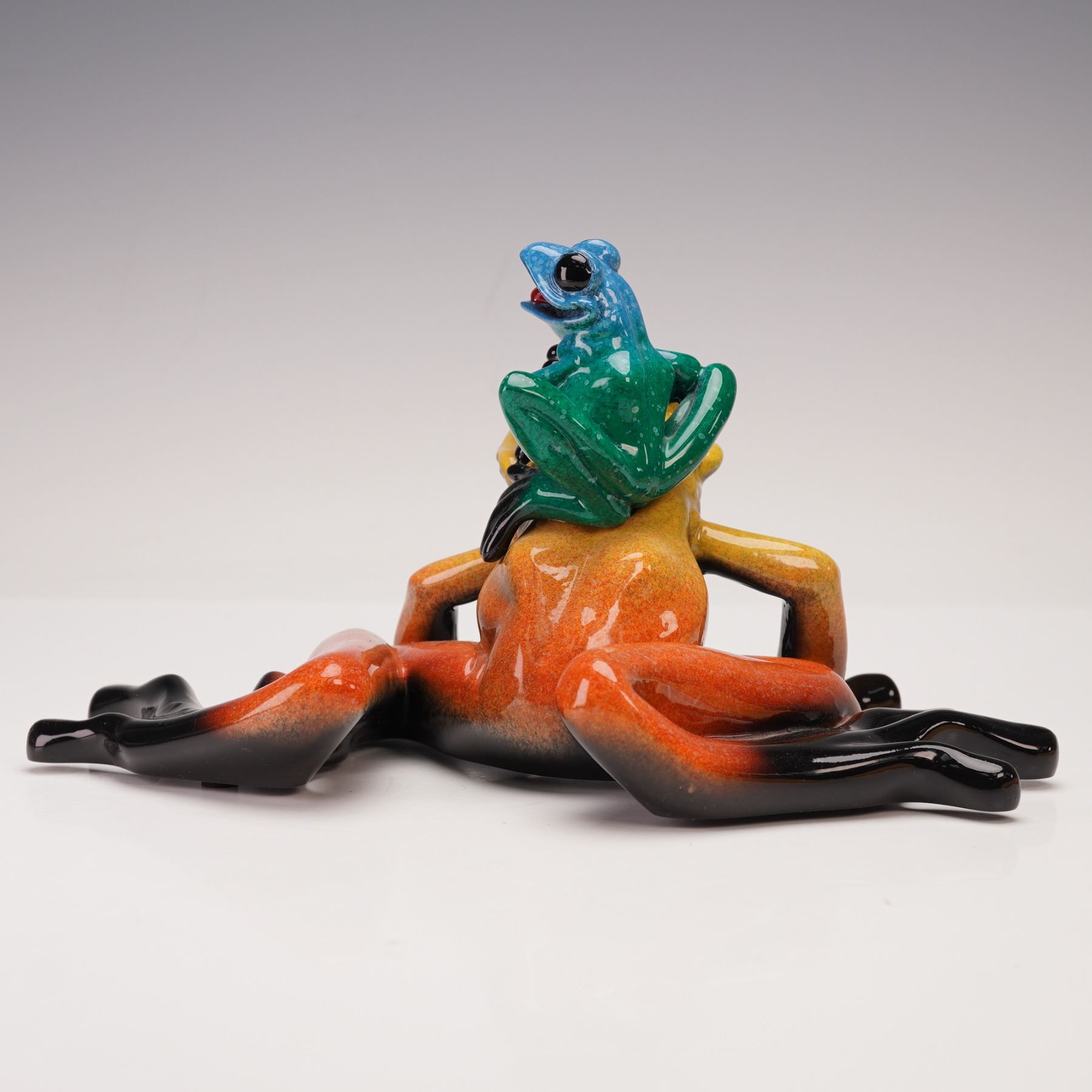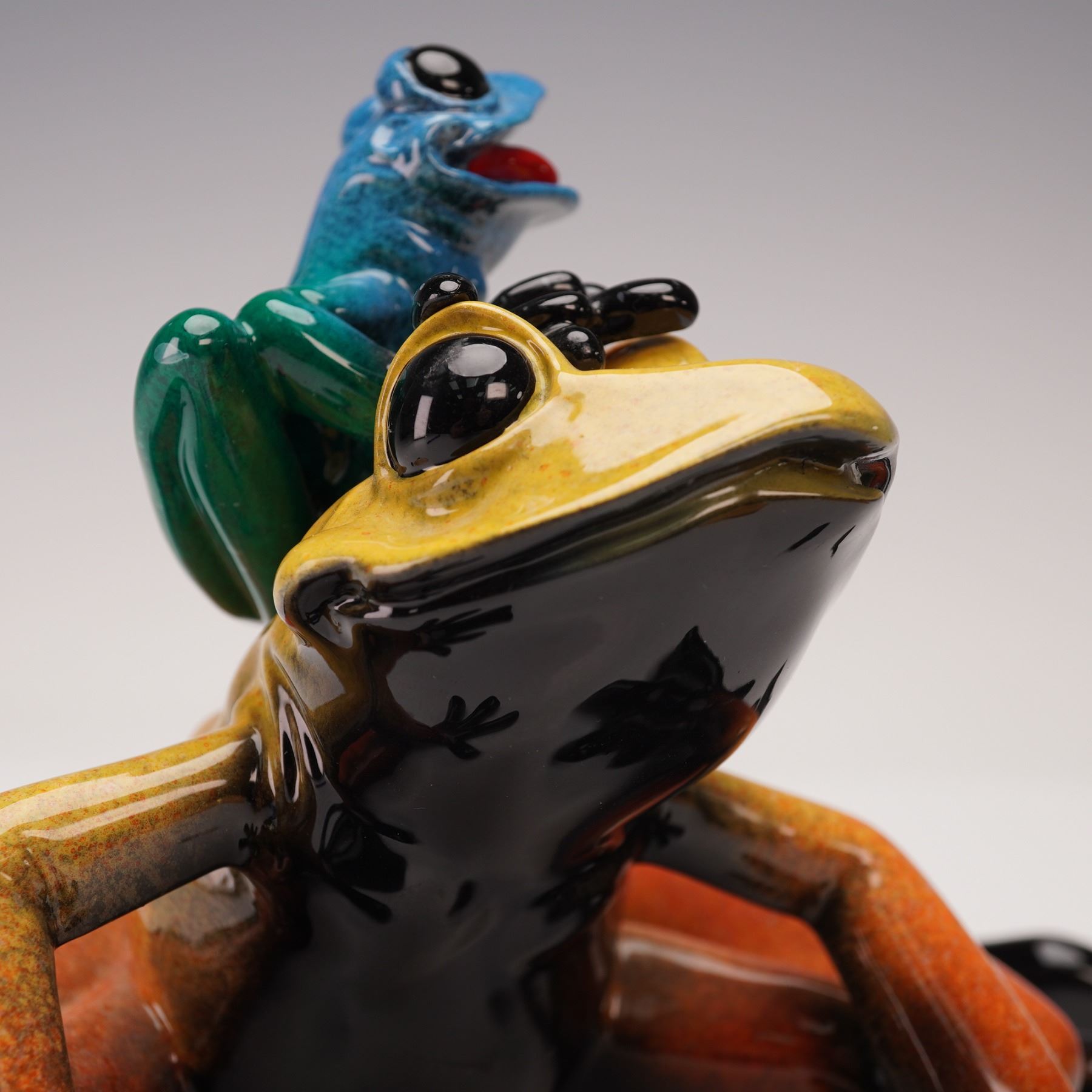 This lively figurine features a bright and glossy mother frog with warm tones of orange, yellow, and black, captured in a relaxed pose. Perched playfully on her back is a smaller blue and green frog with an expressive open mouth, full of energy and charm. The pairing of bold colors and smooth finishes gives the piece a cheerful sense of personality and affection between the two frogs. Marked Kittys Critters. Marked Mama Mia.