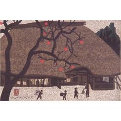 Kiyoshi Saito (19007-1992) Japanese, FARM HOUSE, color woodblock print, 15 x 10", signed, frame...