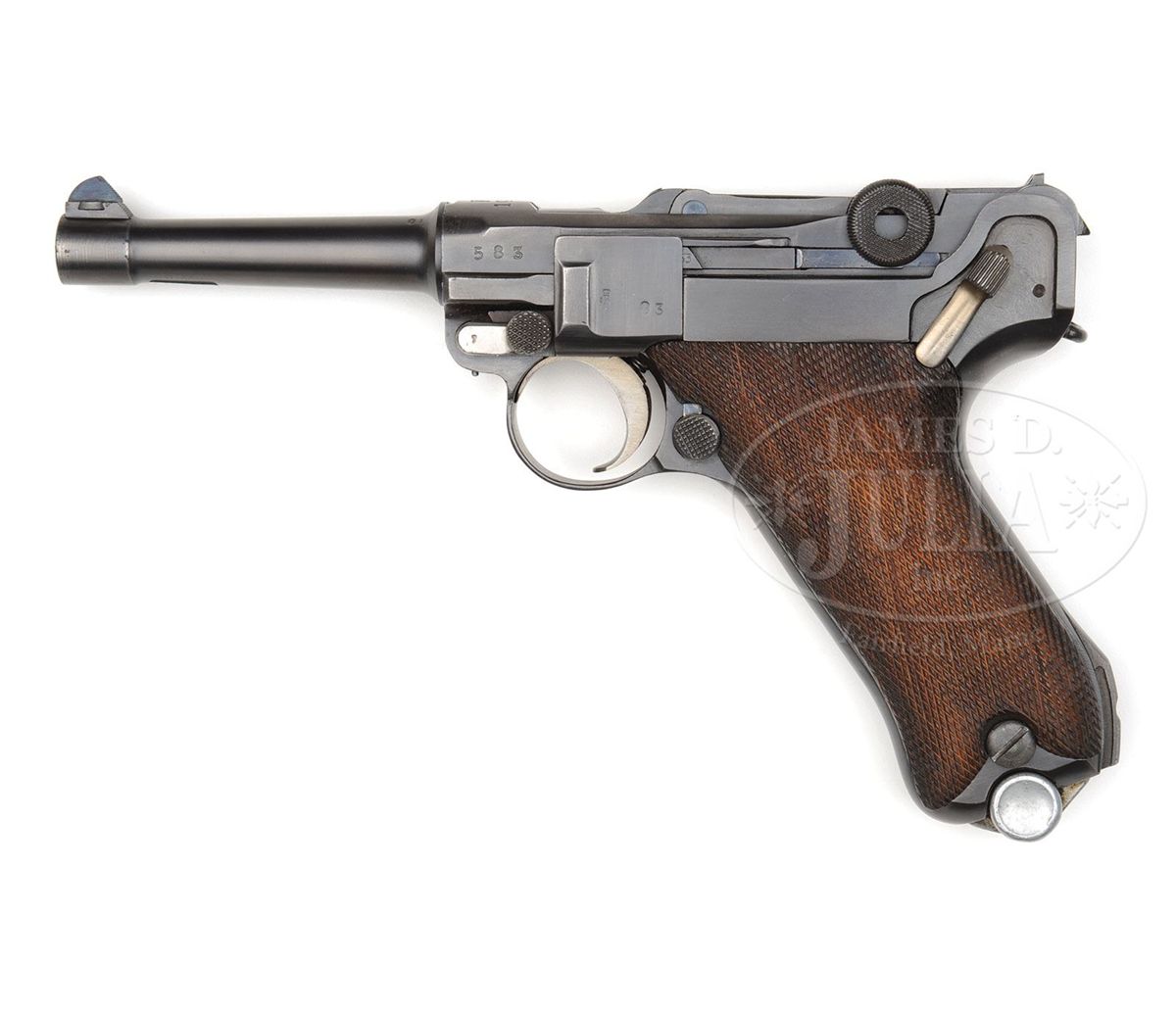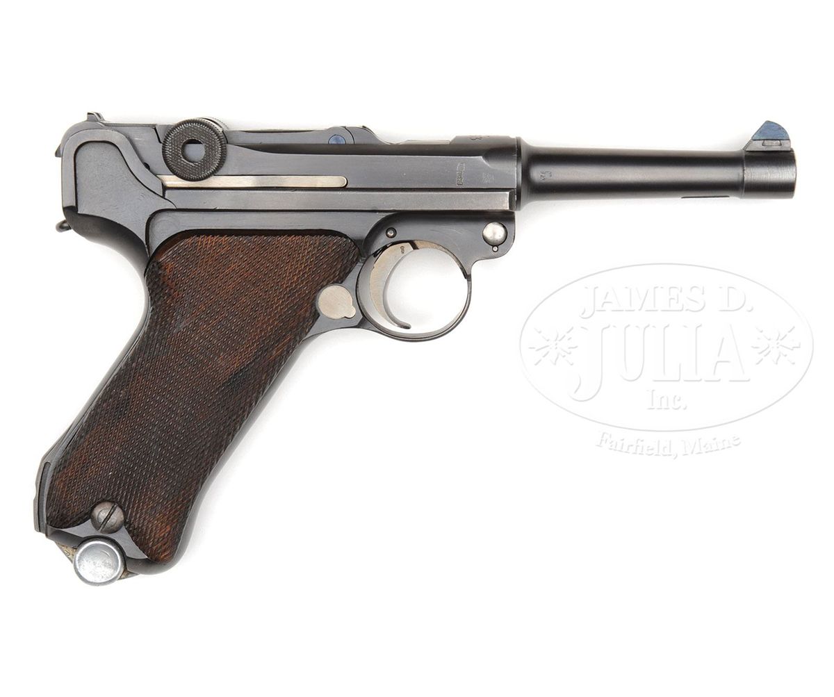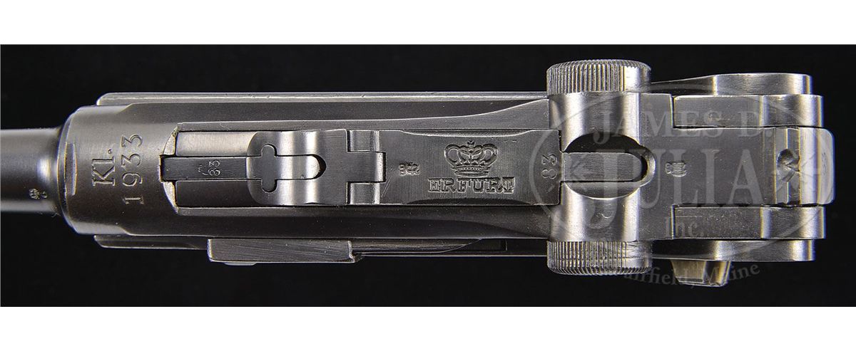 SN 583. 4" 9mm bbl. "Kl. / 1933" above chamber. Crown / "ERFURT" on center toggle link. Three digit serial number in large numbers. Imperial and Weimar Era proofs. All numbered parts on the gun are matching except for the takedown lever which does not match. Checkered walnut grips have three digit matching serial numbers. Aluminum bottom Eagle/63 proofed magazine does not match. The chamber marking identifies this as a P.08 rebuilt at the Heeres-Zeugamt Kassel (Army Ordnance Depot, Kassel)in 1933. This gun is featured on p. 472 of Dr. Geoffrey Sturgess' The Borchardt & Luger Automatic Pistols. PROVENANCE: Collection of Dr. Geoffrey Sturgess. CONDITION: Excellent. Arsenal rebuilt (H.Za. Kassel) and blued to 98% blue and 90% straw. Bore is bright with light wear. Grips have light wear with minor indentations on checkering. Magazine is excellent with light wear on the aluminum bottom. Mechanics are sound. 4-52949 BWS58
