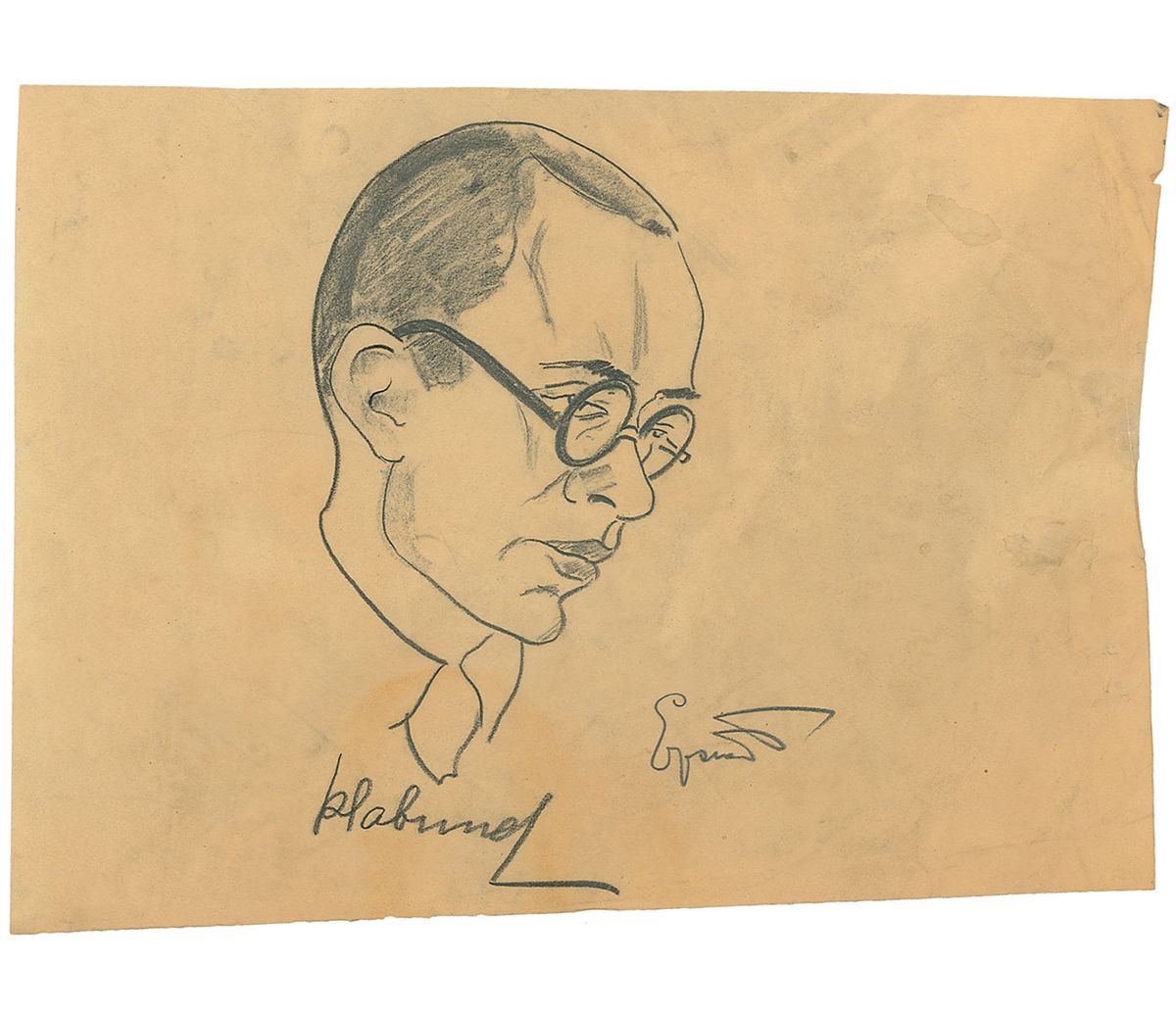 Alfred Henschke (1890–1928), known as Klabund, was a German writer who adapted and translated a number of far-eastern works. An artist’s pencil sketch of a caricature portrait of Klabund on a thin off-white 13.5 x 9.5 sheet of tracing paper, signed in pencil by the artist, “Epstein,” and the subject, “Klabund.” In very good condition, with scattered creases, overall toning, and a few stains.