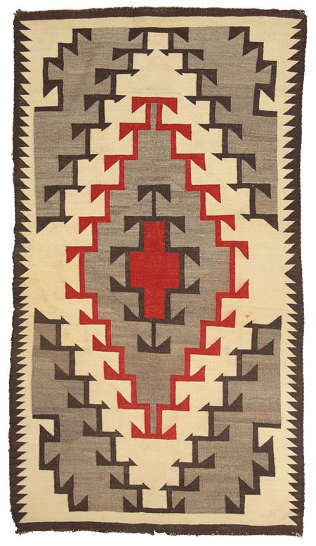 Klagetoh rug of home spun wools in red, white, black, and gray with central motif. 6'11" x 3'9"