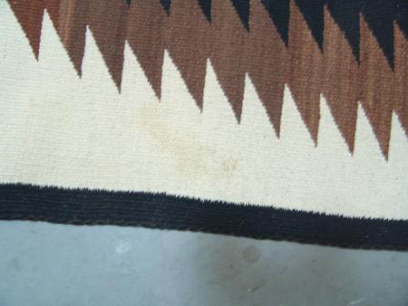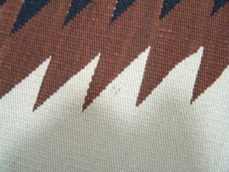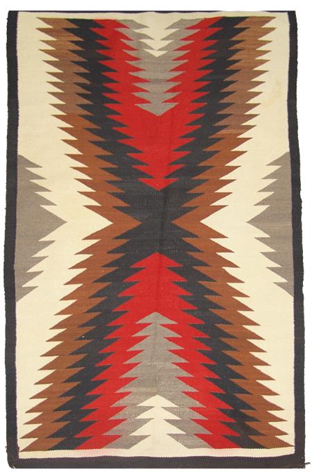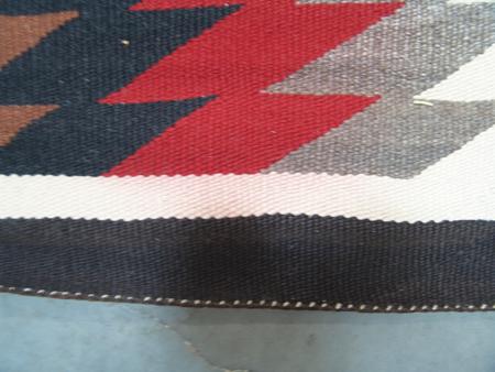 Red, gray, black, and white rug with diamond motif made from home spun wool. 6'1" x 3'7"