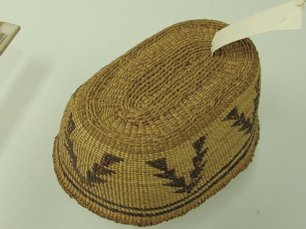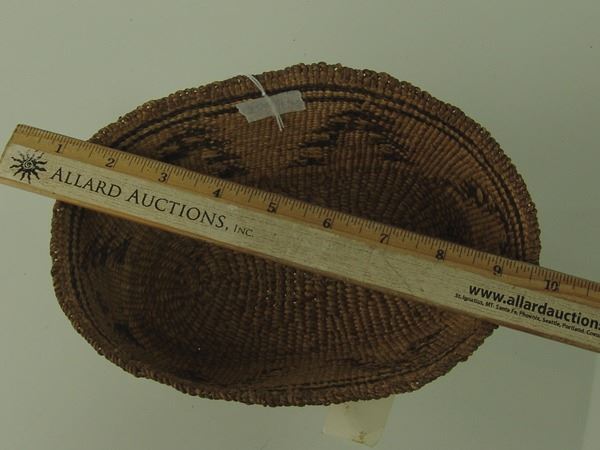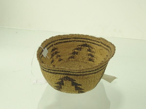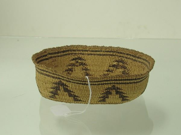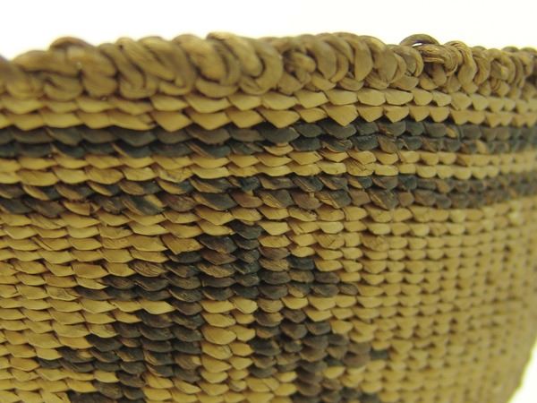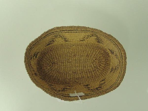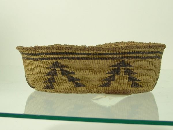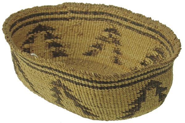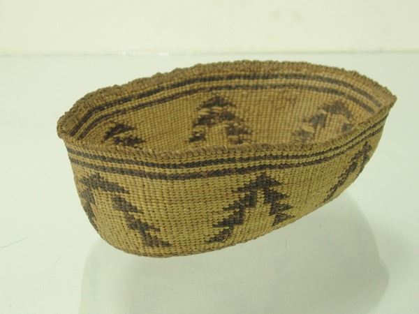 Early 1900s 2-1/2" x 8-1/2" x 6" Unique, oval shaped, pliable weave basketry bowl with tree-like symbols made from stacked right triangles. Very good condition.