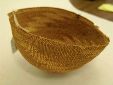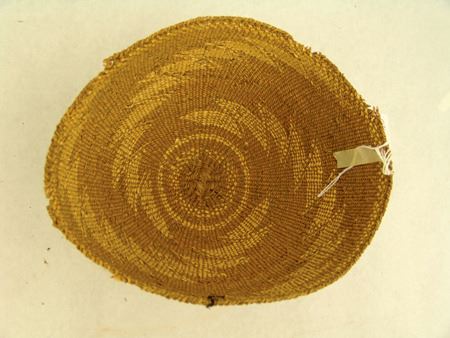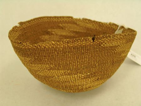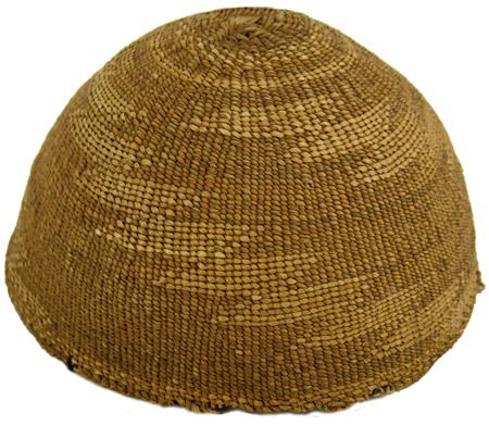 Early 1900s, Rare early woven basketry hat with radiating stepped serrated design. Very good condition, minor rim erosion. Ex. Judge Bonner Collection. 5" x 8"