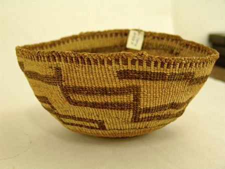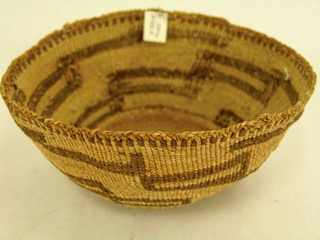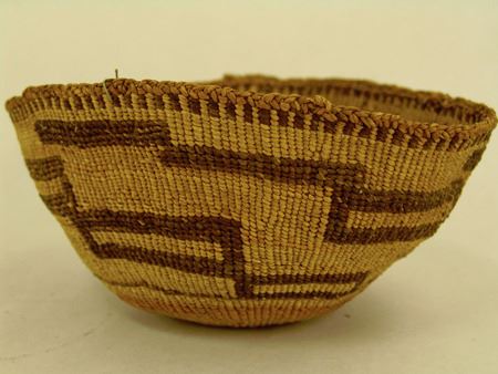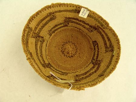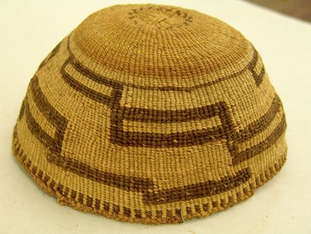 Early 1900s, Rare early soft weave basketry hat with repeating stepped box design. Very good condition. Ex. Judge Bonner Collection. 4" x 7-1/2"