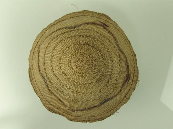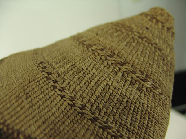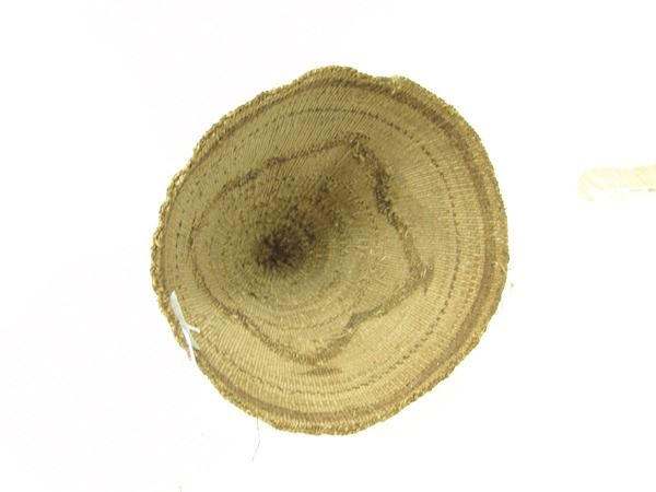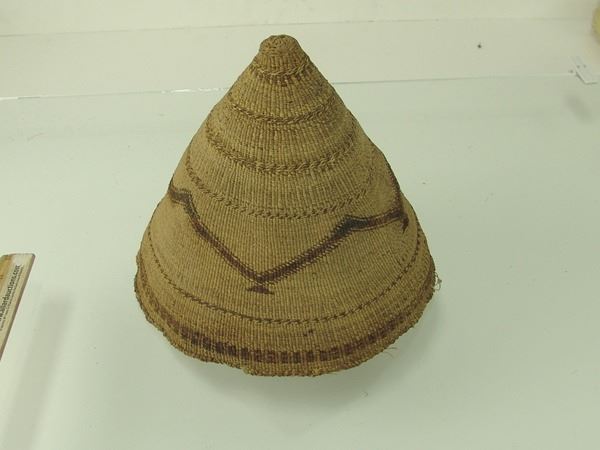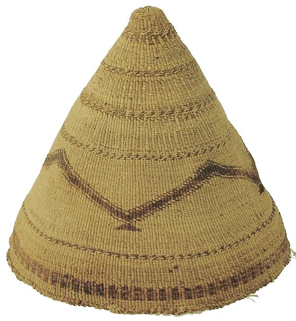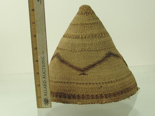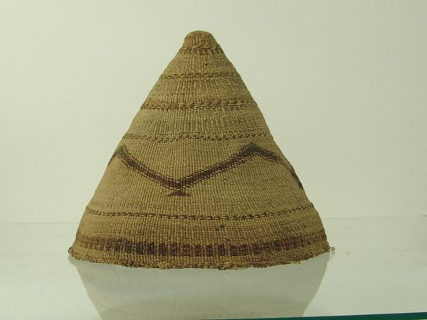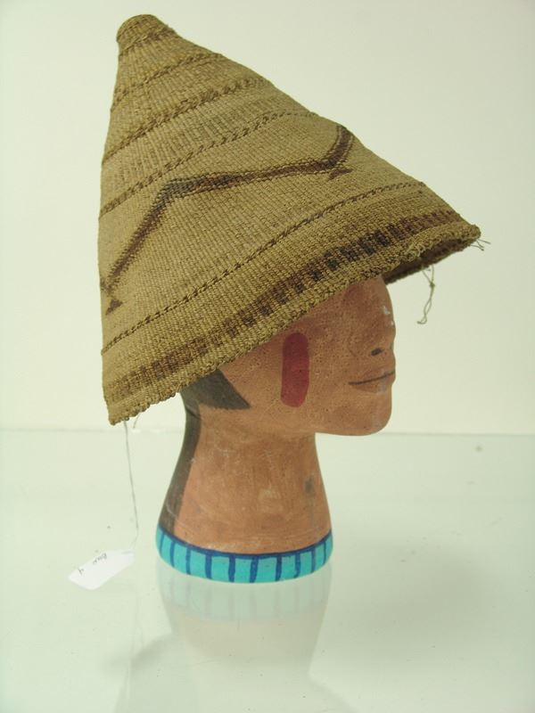 Early 1900s 10" x 10" Traditional, conical shaped, pliable weave hat done in an extra-fine weave with a simple zigzag band, plus several raised design bands. Very good condition.