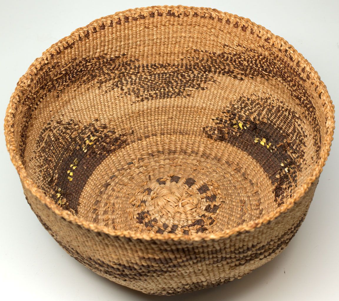 c1900-1930 - A soft-sided twined bowl measuring 9” in diameter and 4.5” tall, with a stacked diamond garland design. Bright yellow porcupine quill stitches may be seen in 3 places within the darker design around the bottom portion of the bowl. No holes. From the S.C. Evans Collection.
