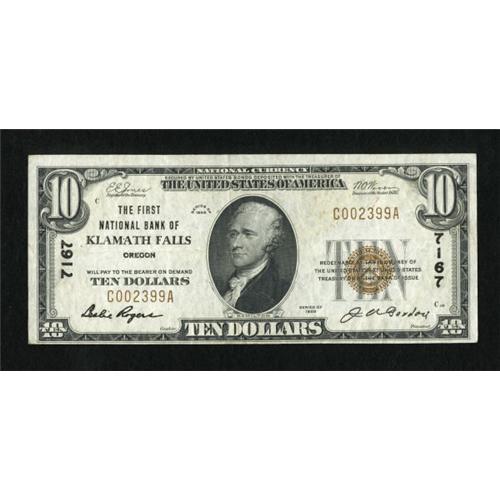 <B>Klamath Falls, OR</B></I> - $10 1929 Ty. 1 <B>The First NB</B></I> Ch. # 7167<BR> Relatively scarce in large size, there are a few more notes available to collectors in small size. Here is a nice <B>Extremely Fine</B></I> for anyone who needs a note on this Klamath County community. While the margins are a bit off center, the note still retains much of its original embossing.<BR><BR><b>Shipping:</b> Coins & Currency (<a target="_blank" href="http://www.heritageauctions.com/common/shipping.php">view shipping information</a>)