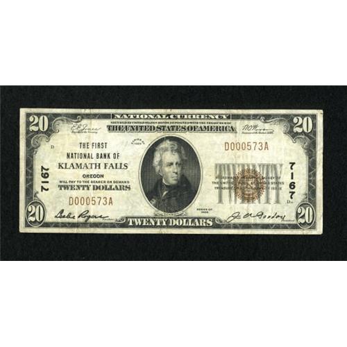 <B>Klamath Falls, OR</B></I> - $20 1929 Ty. 1 <B>The First NB</B></I> Ch. # 7167<BR> This lot provides an opportunity to pick up a second denomination in small size on this most popular town. It is a nicely margined <B>Very Fine</B></I>.<BR><I>From The Kansas City Collection</B></I><BR><BR><b>Shipping:</b> Coins & Currency (<a target="_blank" href="http://www.heritageauctions.com/common/shipping.php">view shipping information</a>)