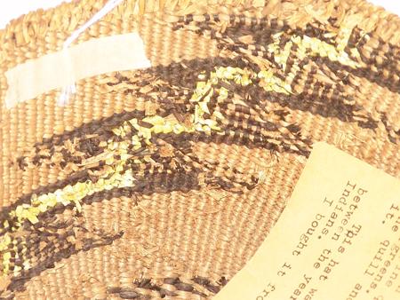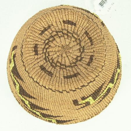 Circa 1900, Traditional soft weave hat with stacked rhomboid figures containing yellow quill accents. Very good condition. 4" x 7" From the Johnson Collection.