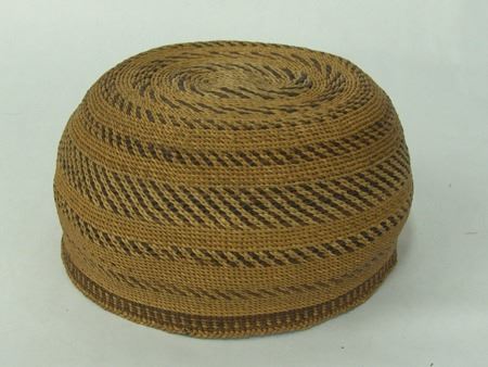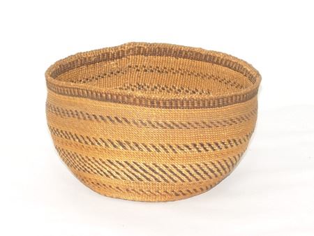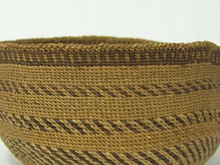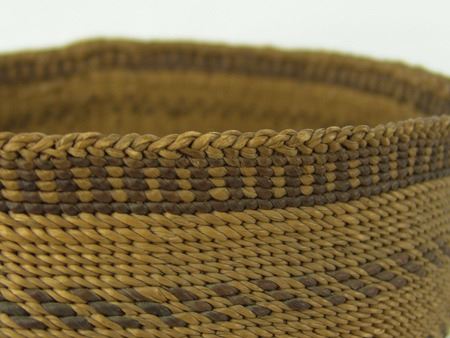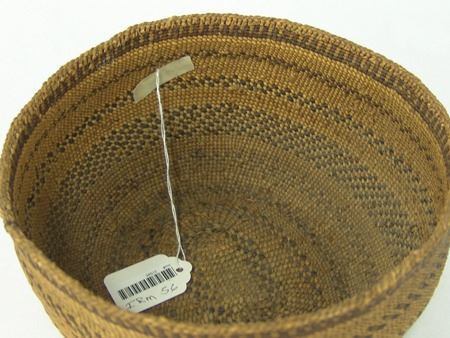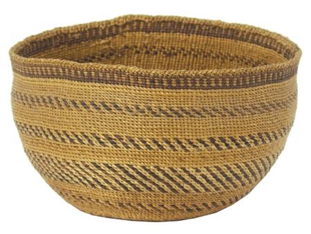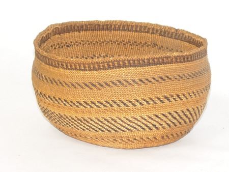 Early 1900s, Fine oval shaped deep bowl with rows of slashes, dark rim band and braided rim. Very good condition, excellent patina. 5" x 8"