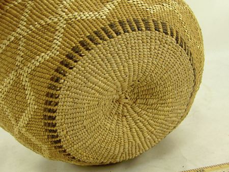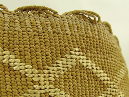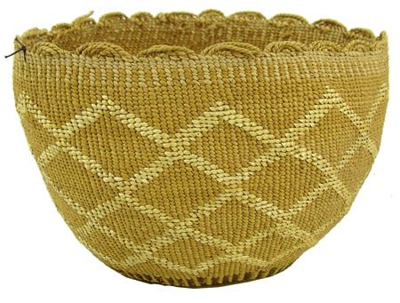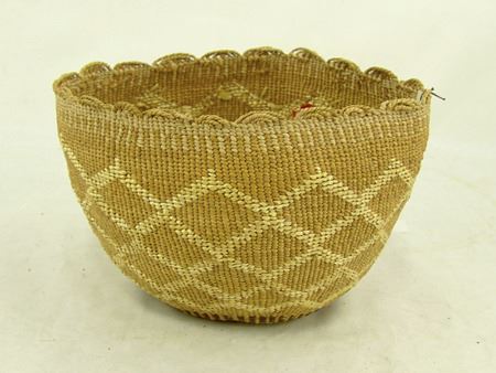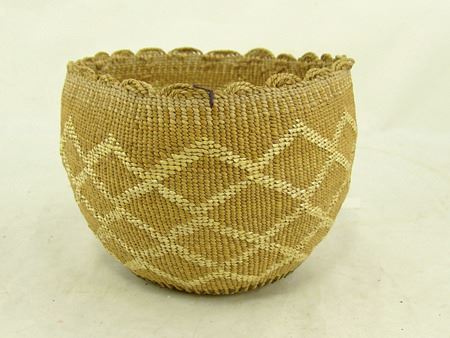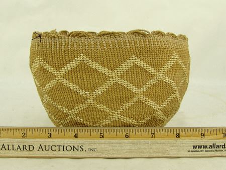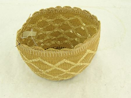 Early 1900s, Wonderful fine pliable weave basketry bowl with connected diamond/X designs done in reverse plus a fine scalloped rim. Very good condition. Ex. Judge Bonner Collection. 5-1/2" x 7"