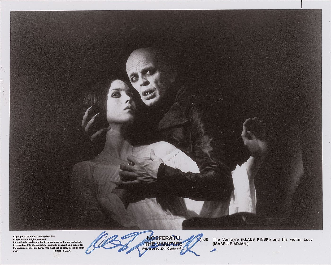 Glossy 10 x 8 Twentieth Century Fox publicity photo for the 1979 film Nosferatu the Vampyre, signed in the lower border in blue felt tip by Kinski. In fine condition.