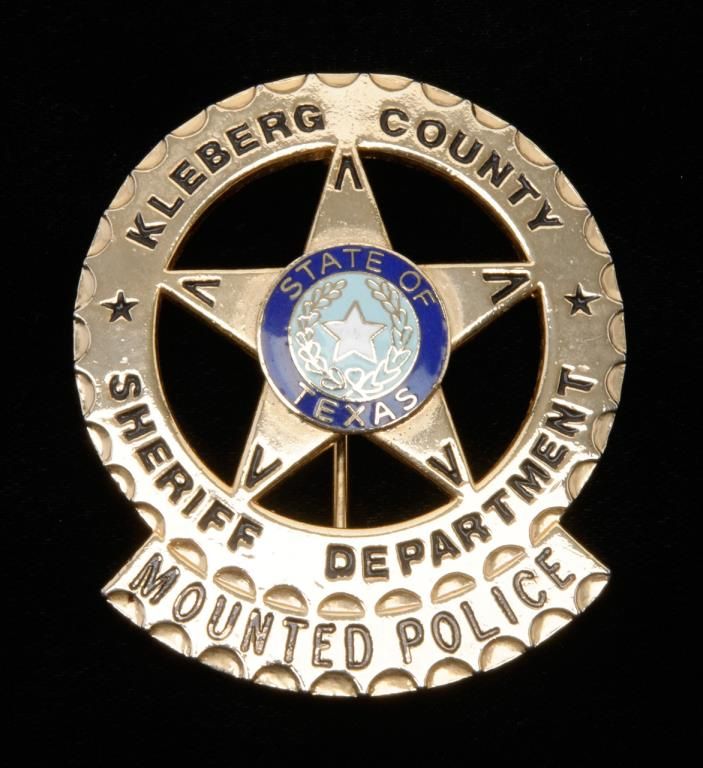 Kleberg County Sheriff Dept. Texas mounted Police re-enactment badge in fine condition. Est.: $100-$200.