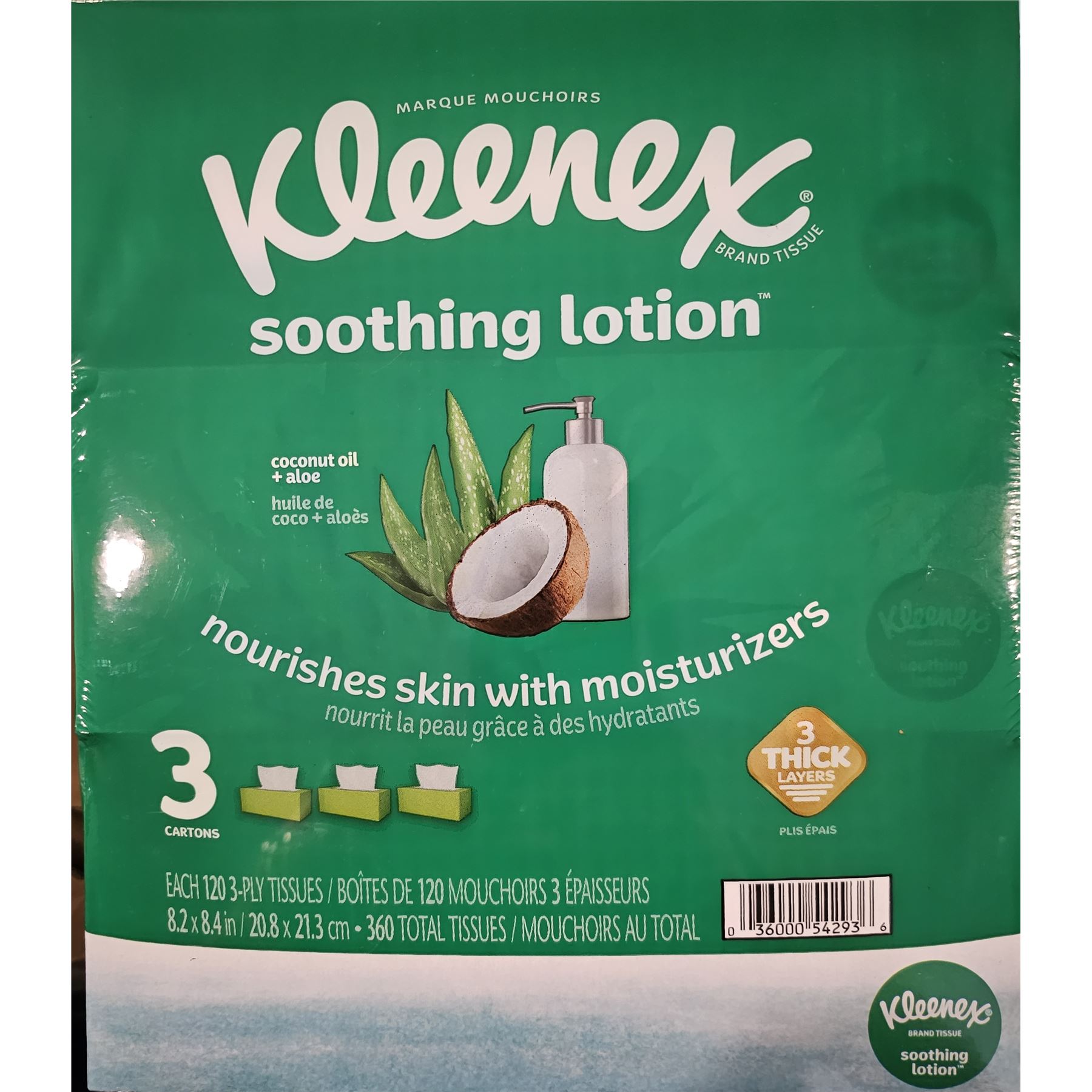 Kleenex with soothing lotion, enriched with coconut oil and aloe, 3-ply for extra softness, 360 sheets total, new.