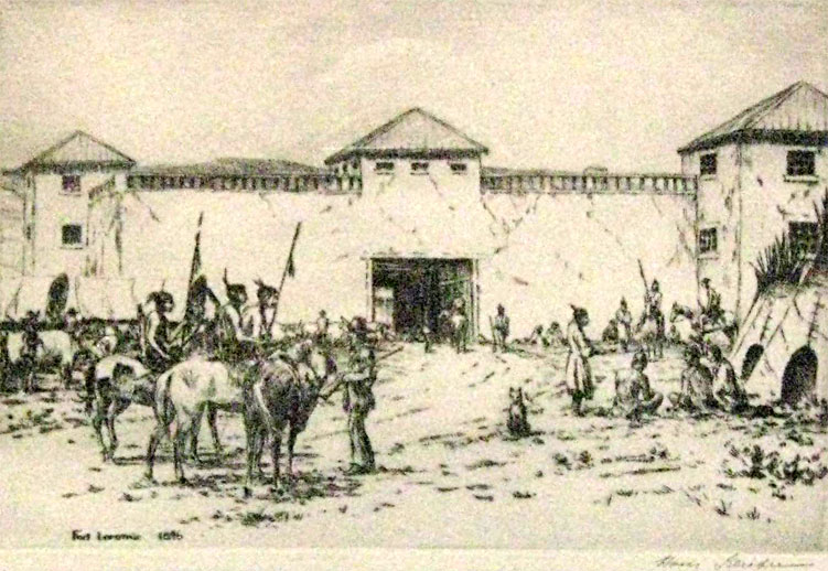 Kleiber, Hans, etching, Fort Laramie, 1846, 7” x 10-1/2”, signed LR.