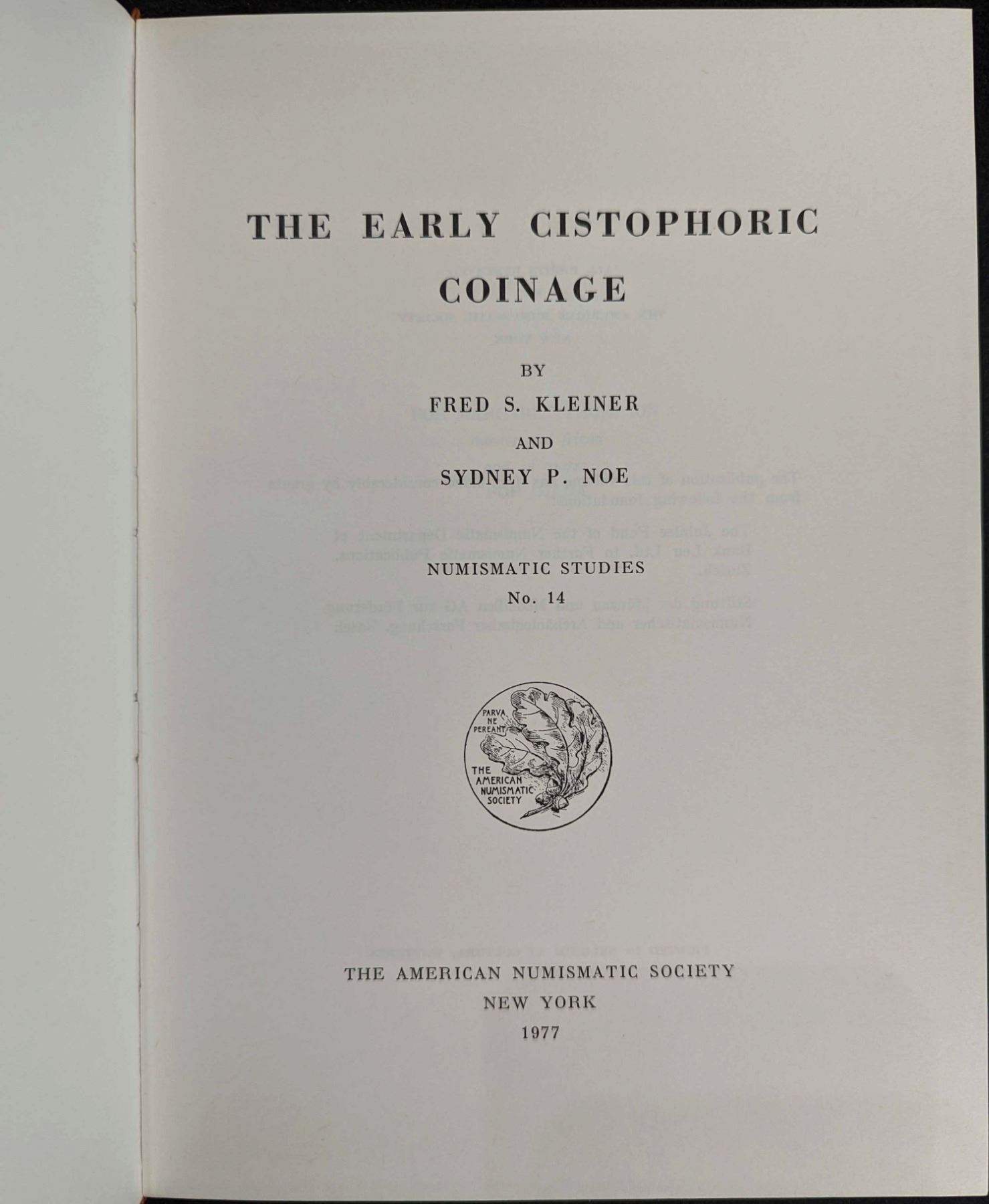 Kleiner, Fred S. & Sydney P. Noe. THE EARLY CISTOPHORIC COINAGE. The American Numismatic Society, New York. 1977. 4to. (8), 128, (4) pages. Original red cloth, gilt. Numismatic Studies No. 14. 38 plates. Fine. With The Early Cistophoric Coinage, Fred S. Kleiner completes nearly twenty years of work by Sydney P. Noe. The material, up to 1962, was collected by Noe and the rest has been supplemented by material that was inaccessible to him at the time, with the arrangement and text composed by Fred S. Kleiner. The book provides a brief history of the study of Cistophoric coins, a catalogue of the coins, brief descriptions of the hoards, several tables and thirty-eight pages of black and white high-quality coin plates. Lot weight: 1 lbs 10oz. Subject(s): Ancient Coinage.