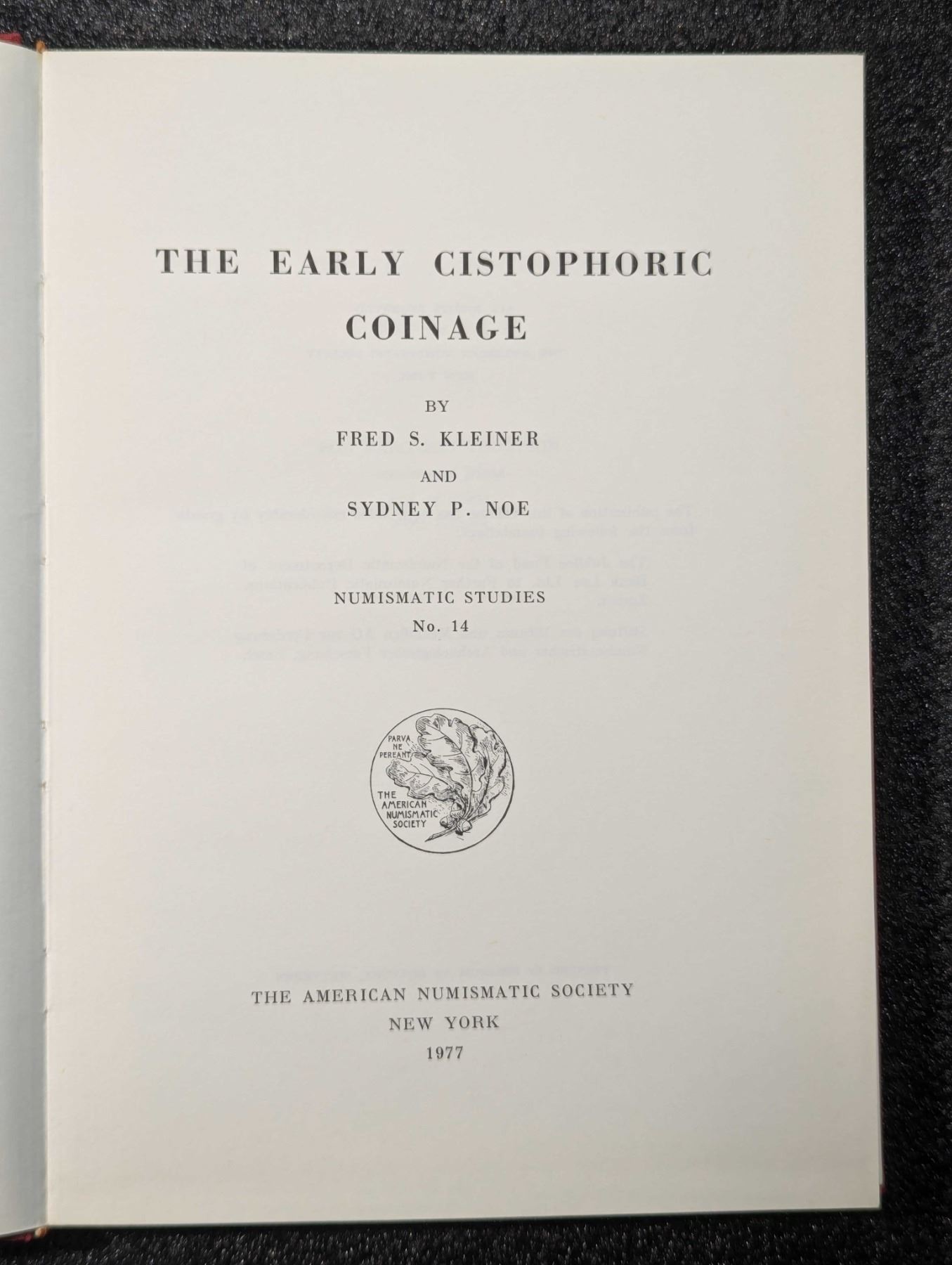 Kleiner, Fred S. & Sydney P. Noe. THE EARLY CISTOPHORIC COINAGE. The American Numismatic Society, New York. 1977. 4to. (8), 128, (4) pages. original red cloth, gilt. Tables. 38 plates. English text. Fine. Numismatic Studies No. 14. With The Early Cistophoric Coinage, Fred S. Kleiner completes nearly twenty years of work by Sydney P. Noe. The material, up to 1962, was collected by Noe and the rest has been supplemented by material that was inaccessible to him at the time, with the arrangment and text composed by Fred S. Kleiner. The book provides a brief history of the study of cistophoric coin, a catalogue of the coins, brief descriptions of the hoards, several tables and thirty-eight pages of black and white high-quality coin plates. Lot weight: 1 lbs 10oz. Subject(s): Ancient Coinage.