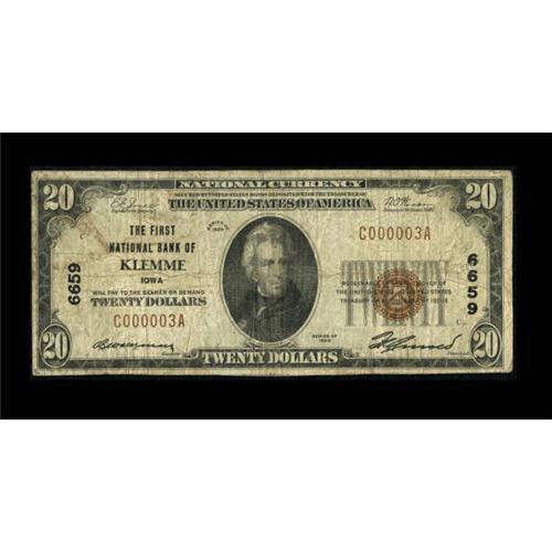 <B>Klemme, IA</B></I> - $20 1929 Ty. 1 <B>The First NB</B></I> Ch. # 6659<BR> This perfectly original note boasts solid paper for the grade and Serial Number 3. <B>Very Good.</B></I><BR><BR><b>Shipping:</b> Coins & Currency (<a target="_blank" href="http://www.heritageauctions.com/common/shipping.php">view shipping information</a>)