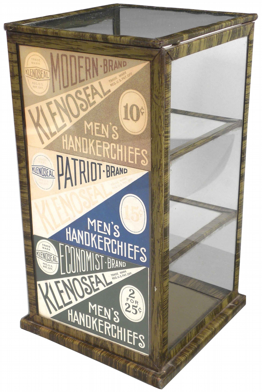 Klenoseal Men's Handkerchief Store Display. Glass and metal. Some fading to front otherwise excellent condition. 6 X 11 X 6 inches.