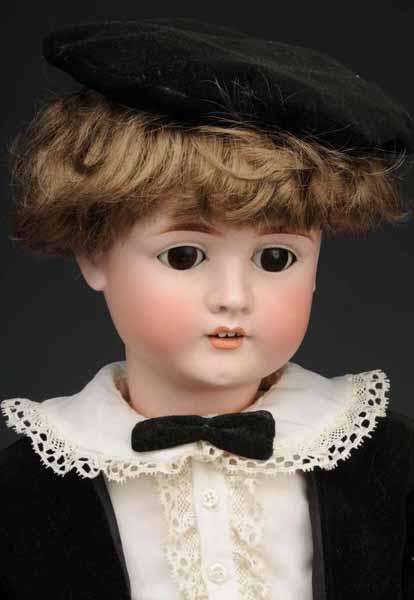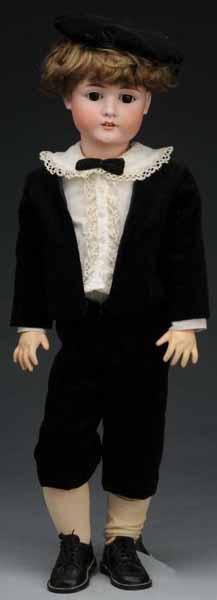Description Germany, Ca. 1900. Bisque socket head incised "282 KH Walkure", head made by Kestner for K & H, sleeping eyes, open mouth, chin dimple, replaced wig. Jointed composition body (repainted). New velvet boy’s suit. Condition (Very Good). Size 32" T.