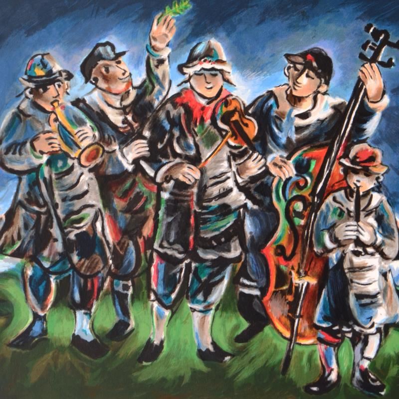 "Klezmer" is a limited edition lithograph on paper, numbered hand signed by Yosl Bergner (1920-2017). Includes Certificate of Authenticity. Measures approx. 24.5" x 21" (with border), 22" x 18.5" (image).