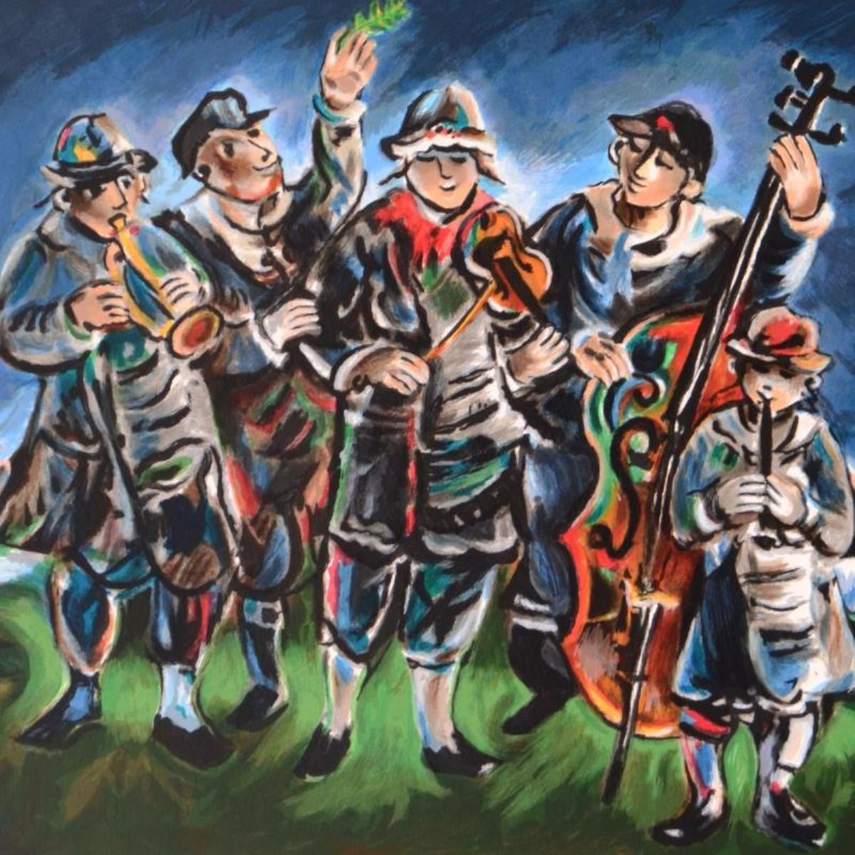 Klezmer by Bergner (1920-2017). "Klezmer" is a limited edition lithograph on paper, numbered hand signed by Yosl Bergner (1920-2017). Includes Certificate of Authenticity. Measures approx. 24.5" x 21" (with border), 22" x 18.5" (image).