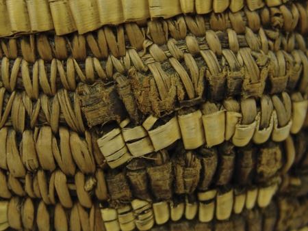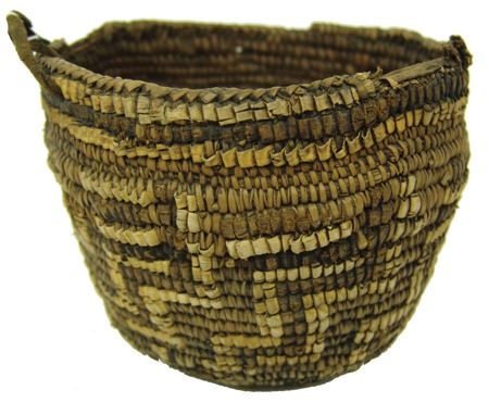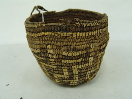 Late 1800s, Very old hard-sided cooking basket with imbricated stepped geometric design on the exterior. Good condition, sturdy and intact, but with many broken/damaged stitches. 4-1/2" x 5-1/2"