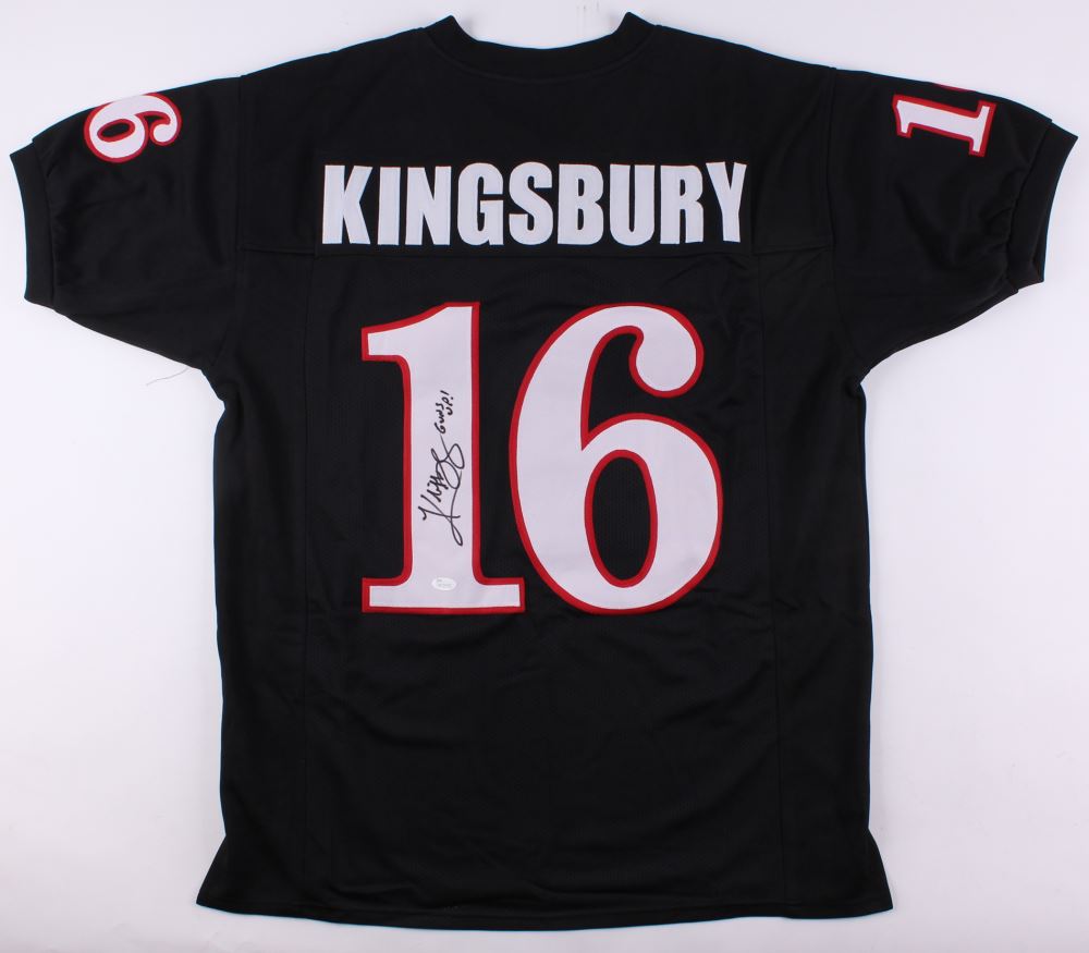 Custom on-field style jersey. Everything sewn on, size XL. Hand-signed and inscribed in black felt-tip pen by Kliff Kingsbury.