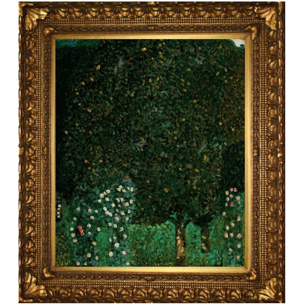 Hand painted oil reproduction of a famous Klimt painting, Rosiers sous les Arbres. The original masterpiece was created in 1905. Today it has been carefully recreated detail-by-detail, color-by-color to near perfection. 20x24 KL2267 OS00225 (ornate gold frame)