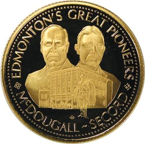Klondike Mike Salutes 1978 XI Commonwealth Games / Edmonton’s Great Pioneers McDougall - Secord, Gem Proof, Reeded Edge, 33mm 28.2 grams 24 karat gold. Heavy cameos on deeply mirrored fields