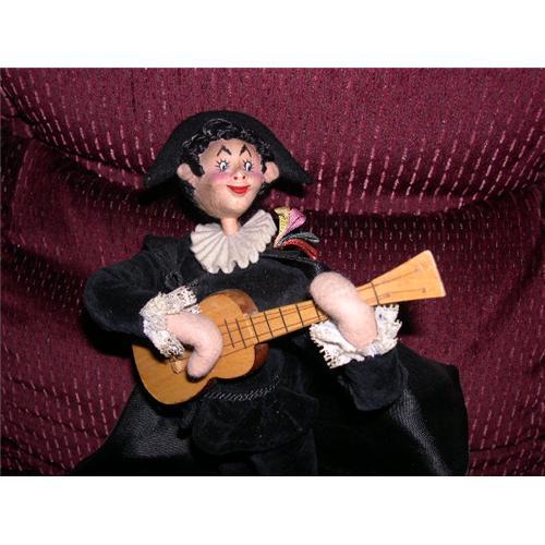This is a Klumpe or Roldan type man who is playing his guitar. He's about 12" tall and has a very nice outfit. His hair is a type of black rolled thread. He has very upside down V type eyebrows. He's got a great costume. He is from a smoke free environment. Buyer to pay $10.00 for U.S. mailing, insurance, and handling.