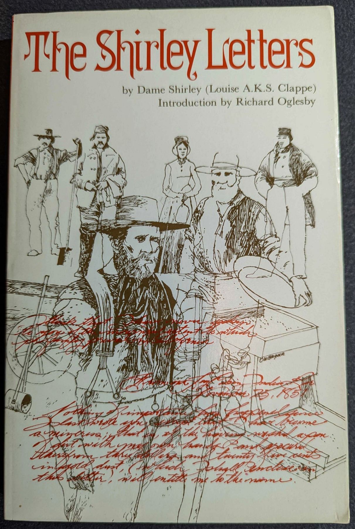 Knapp Smith Clappe, Louise Amelia 'Dame Shirley'. THE SHIRLEY LETTERS. BEING LETTERS WRITTEN IN 1851-1852 FROM THE CALIFORNIA MINES. Peregrine Smith Books, Salt Lake City. 1991. 12mo. xviii, (6), 199, (1) pages. Original pictorial card covers. Reprint of the 1954/55 serial original. Map. Fine. This book is a collection of letters written by the author. An excellent collection of first-hand accounts of the California Gold Rush. Lot weight: 0 lbs 10oz. Subject(s): California Gold Rush History.