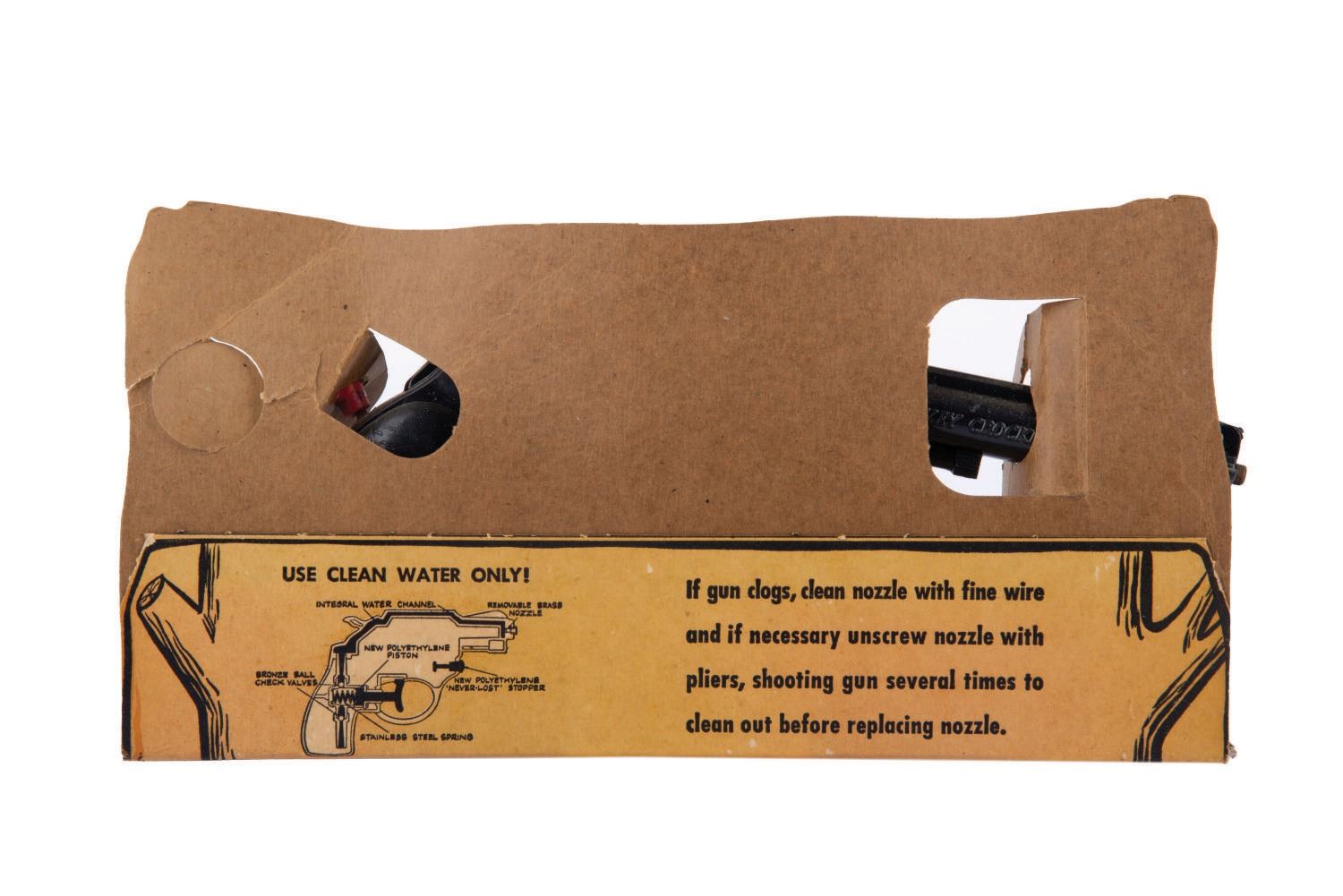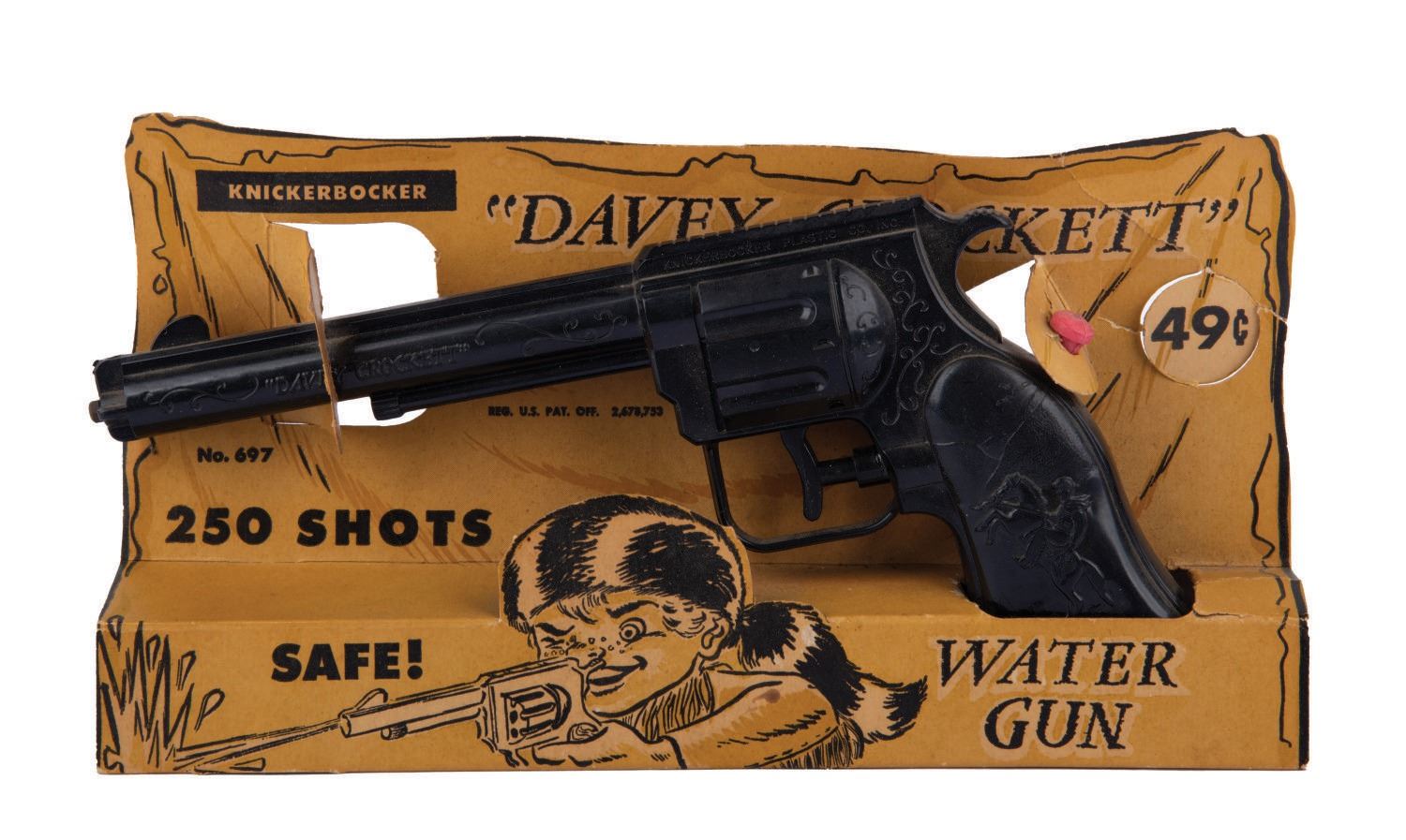 (Knickerbocker, 1950s) A "Davey Crockett" Water gun. This plastic toy water pistol is unused in its original packaging. The 8.5"x4" gun is in fine condition gun, with the 9.5"x5.5" card in good condition, with creases and small tears to the right side of the card. Both have light wear from age and display.